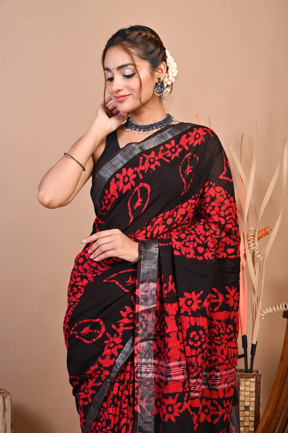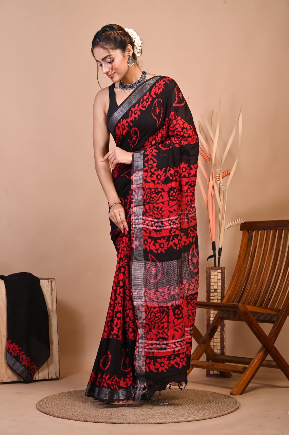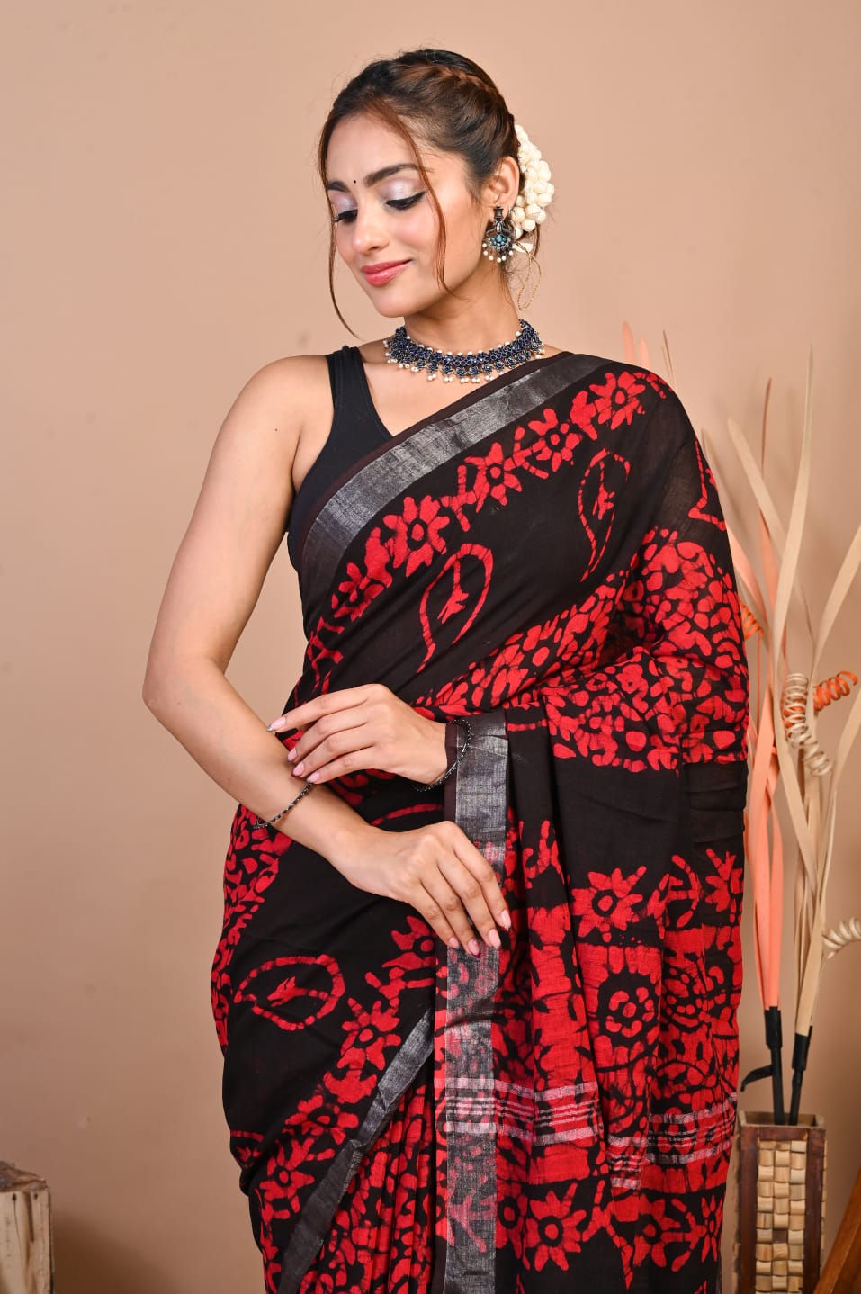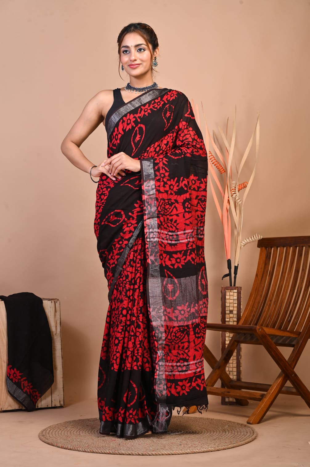Add a touch of sophistication to your wardrobe with our Hand Block Printed Linen Cotton Saree. This 5.5-meter saree is crafted with intricate hand block prints, exuding traditional charm. Paired with a 1-meter unstitched blouse piece, it offers ample customization options. The luxurious linen-cotton blend ensures both comfort and style, making it perfect for any occasion. Elevate your ethnic wear collection with this timeless piece of elegance.