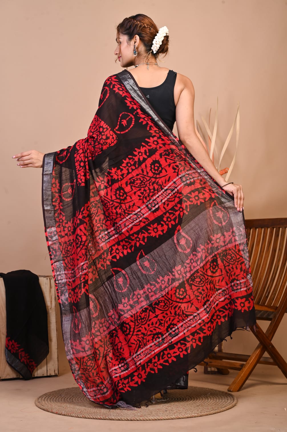 Aziza Black Color Hand Block Printed Linen Cotton Saree with Unstitched Blouse Piece