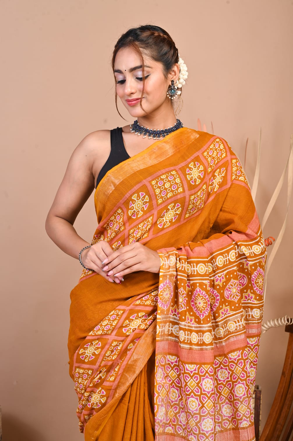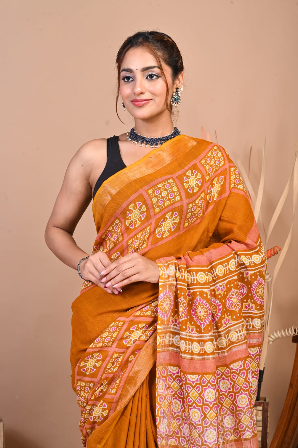 Add a touch of sophistication to your wardrobe with our Hand Block Printed Linen Cotton Saree. This 5.5-meter saree is crafted with intricate hand block prints, exuding traditional charm. Paired with a 1-meter unstitched blouse piece, it offers ample customization options. The luxurious linen-cotton blend ensures both comfort and style, making it perfect for any occasion. Elevate your ethnic wear collection with this timeless piece of elegance.