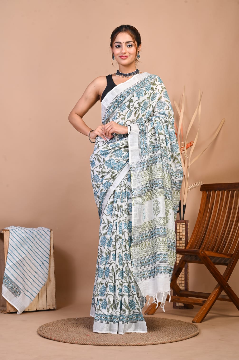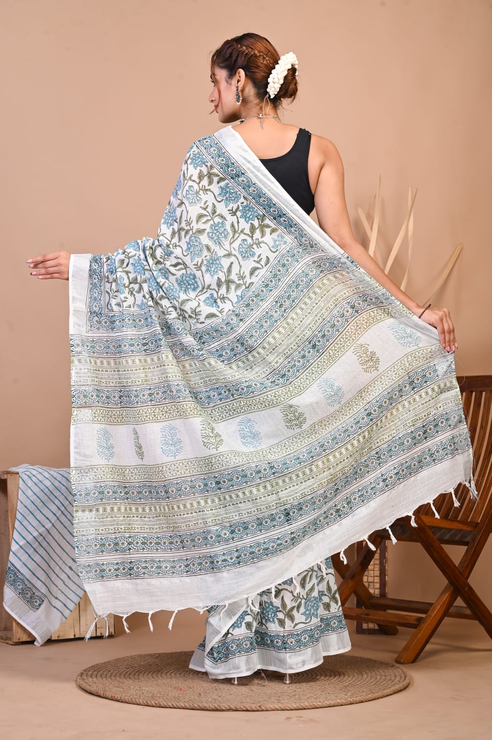 Sakshi White Color Linen Cotton Hand Block Floral Printed Saree with Unstitched Blouse Piece
