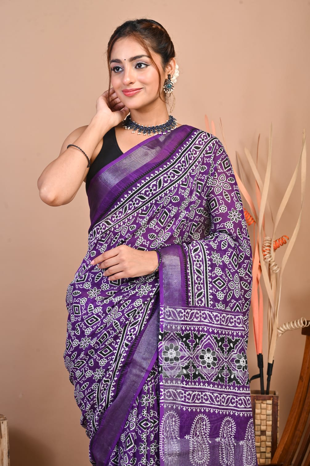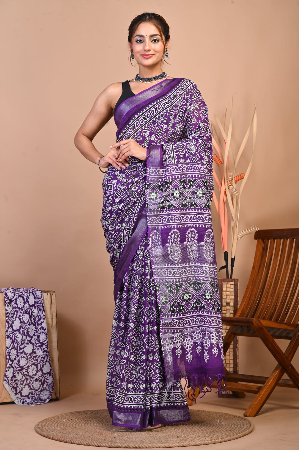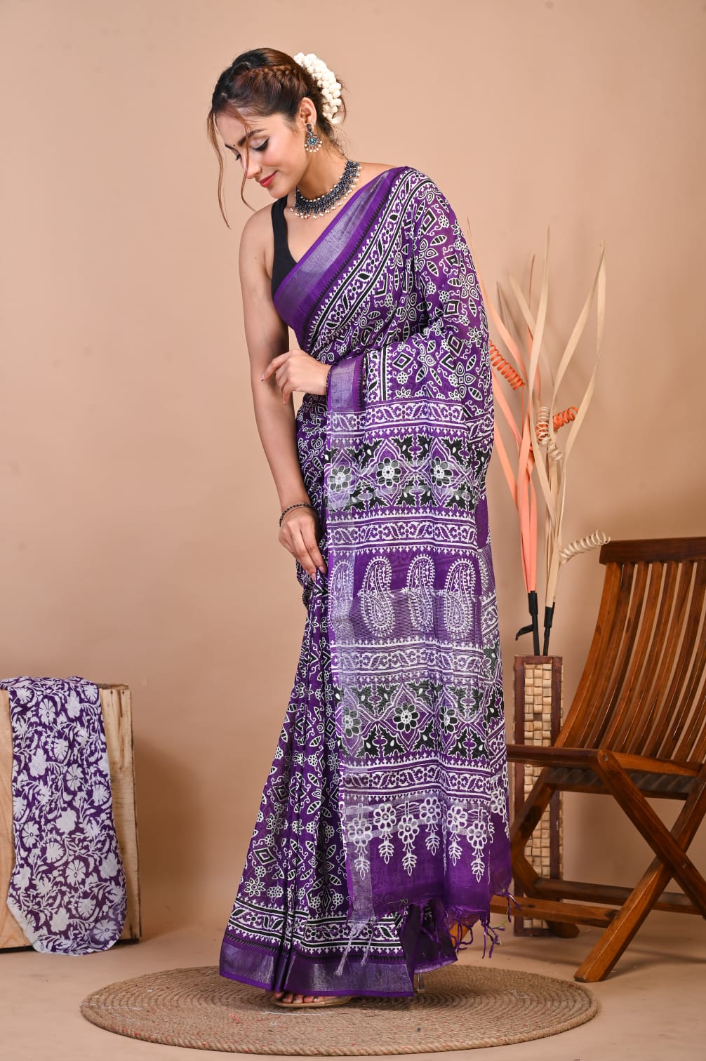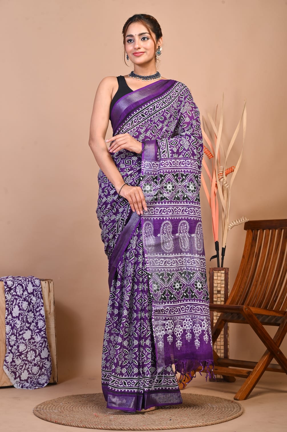 Nazia Purple Color Linen Cotton Hand Block Printed Saree with Unstitched Blouse Piece