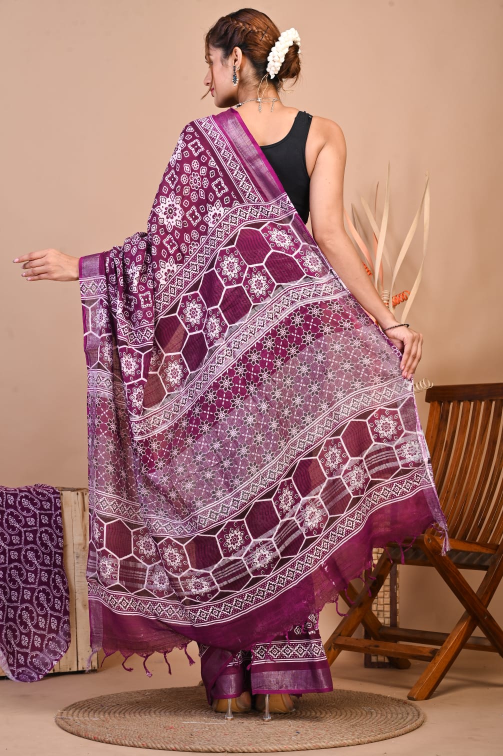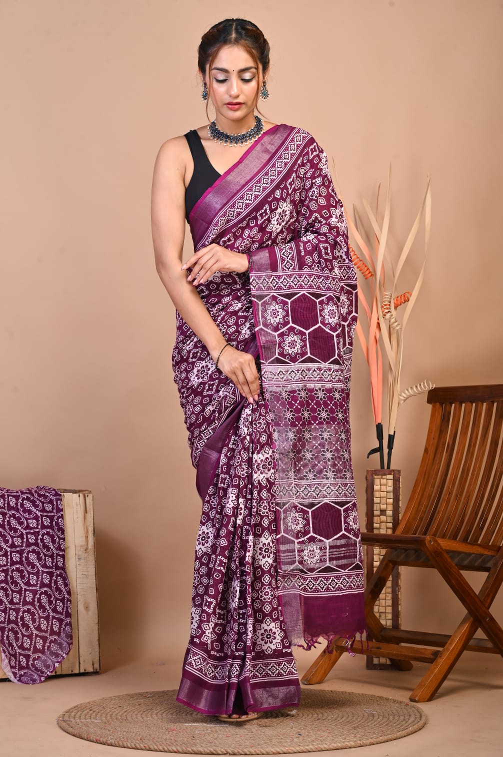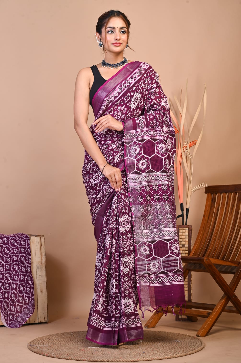 Poonam Wine Color Linen Cotton Hand Block Printed Saree with Unstitched Blouse Piece