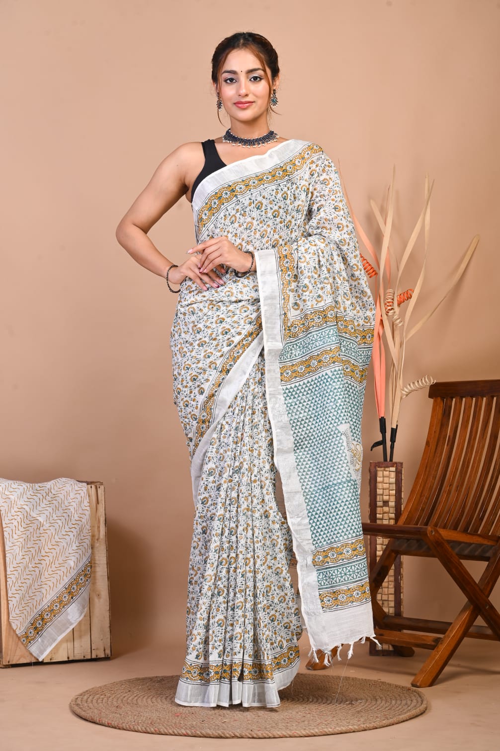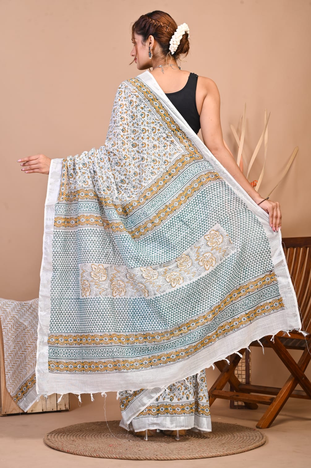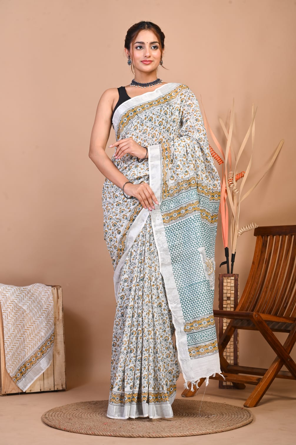 Anamika White Color Linen Cotton Hand Block Floral Printed Saree with Unstitched Blouse Piece