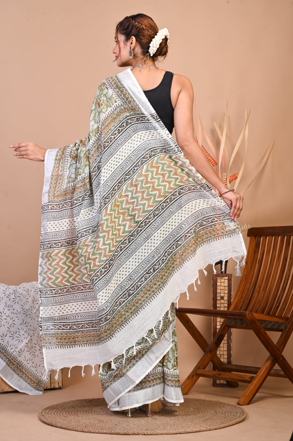 Samantha White Green Color Linen Cotton Hand Block Floral Printed Saree with Unstitched Blouse Piece