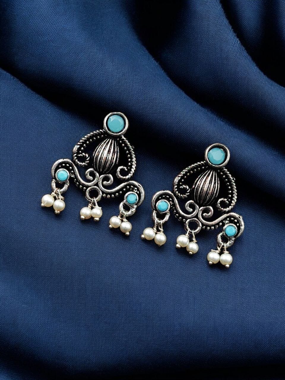 Aqua Ethnic Indian Silver-toned Oxidized Earring Affordable Stud with Pearl Beads Drop for Women