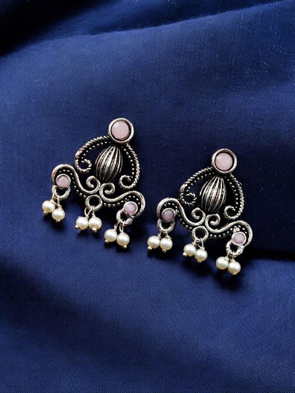 Pink Ethnic Indian Silver-toned Oxidized Earring Affordable Stud with Pearl Beads Drop for Women