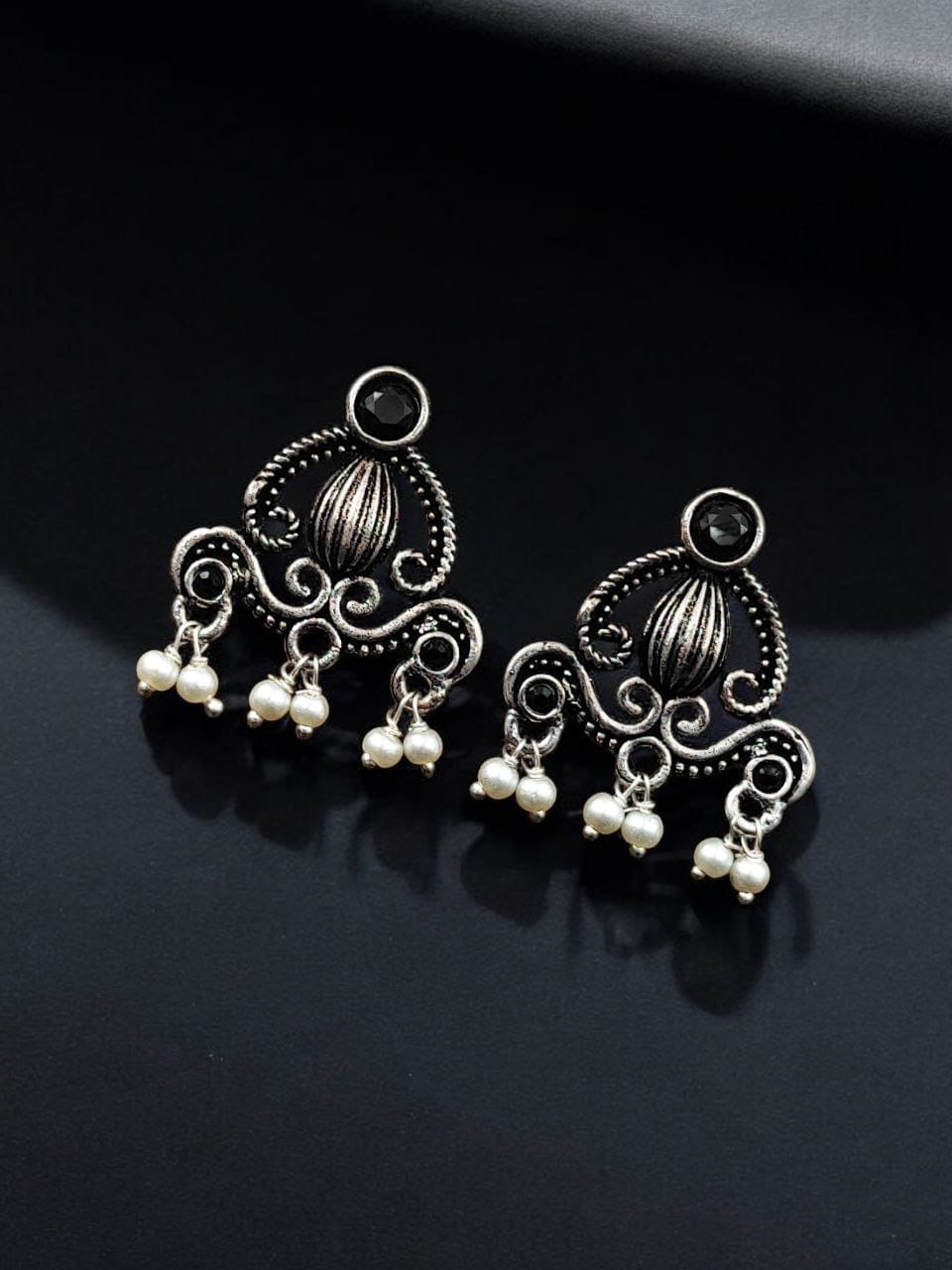 Black Ethnic Indian Silver-toned Oxidized Earring Affordable Stud with Pearl Beads Drop for Women