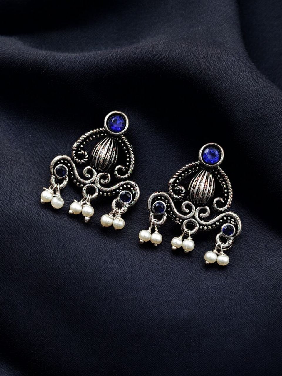 Blue Ethnic Indian Silver-toned Oxidized Earring Affordable Stud with Pearl Beads Drop for Women