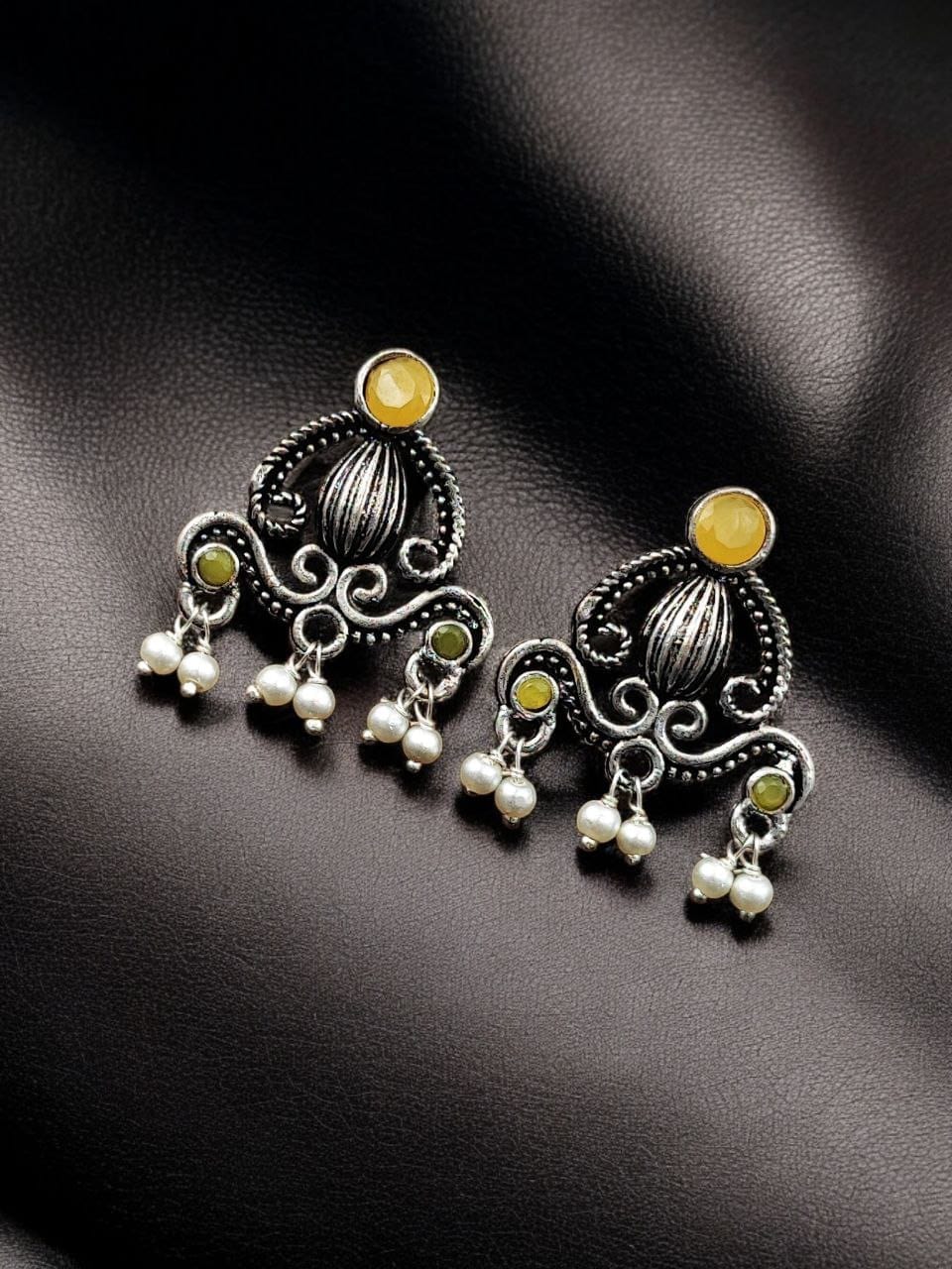 Yellow Ethnic Indian Silver-toned Oxidized Earring Affordable Stud with Pearl Beads Drop for Women