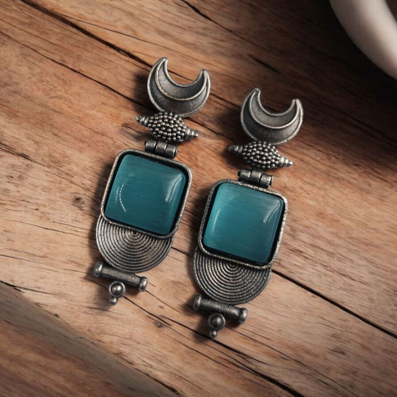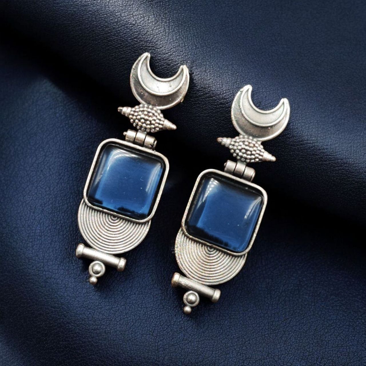 Blue Stunning Crescent Moon Designer Silver Oxidized Earring Drop Dangler Monalisa Stone Earrings for Women