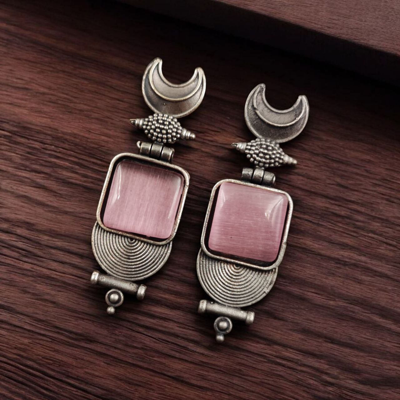 Baby Pink Stunning Crescent Moon Designer Silver Oxidized Earring Drop Dangler Monalisa Stone Earrings for Women