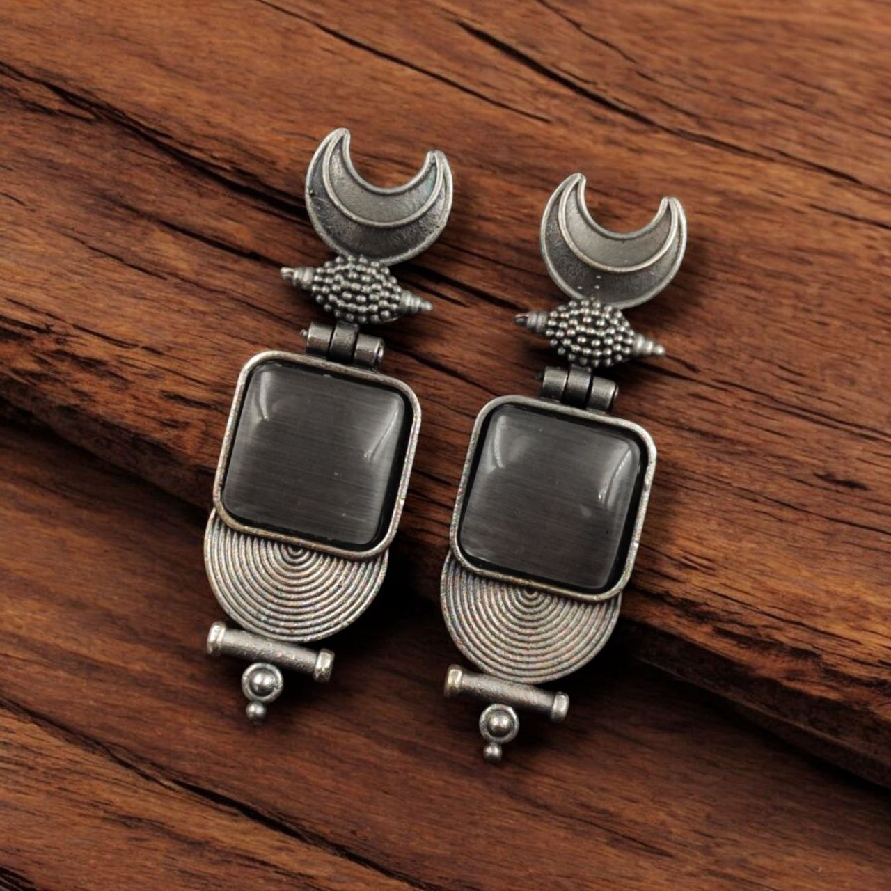 Grey Stunning Crescent Moon Designer Silver Oxidized Earring Drop Dangler Monalisa Stone Earrings for Women