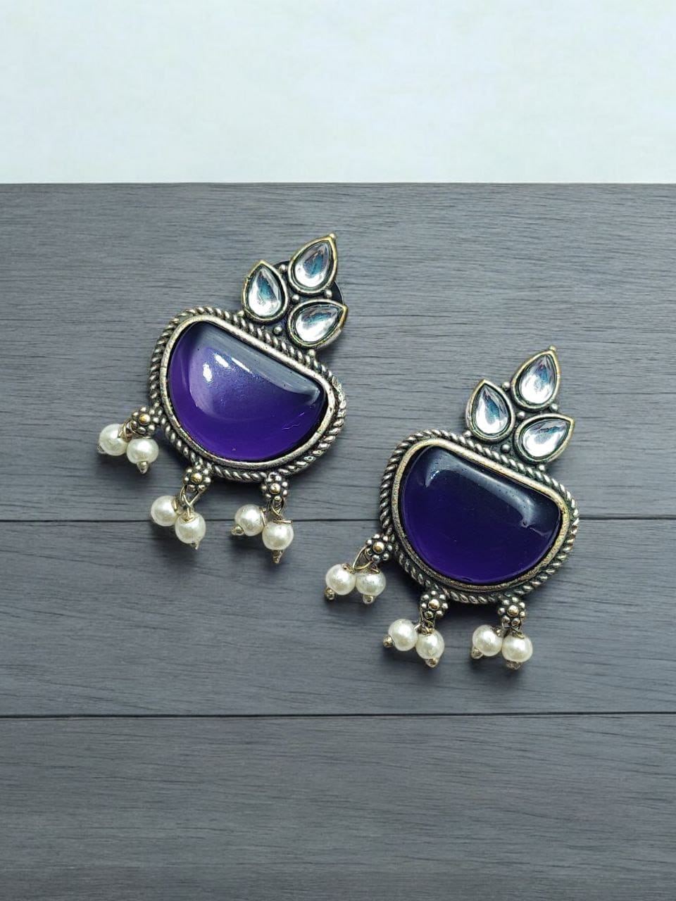 Amethyst Traditional Indian Monalisa Stone Stud Tops Earring Ethnic Silver Oxidized Earring Set for Girls