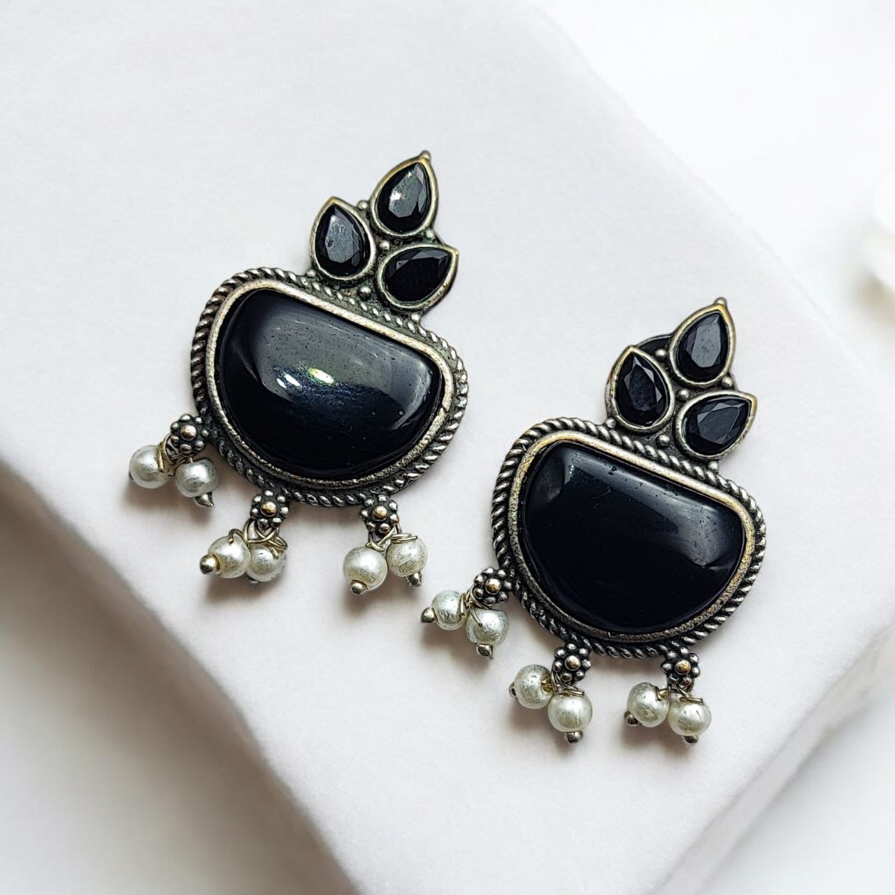 Black Traditional Indian Monalisa Stone Stud Tops Earring Ethnic Silver Oxidized Earring Set for Girls