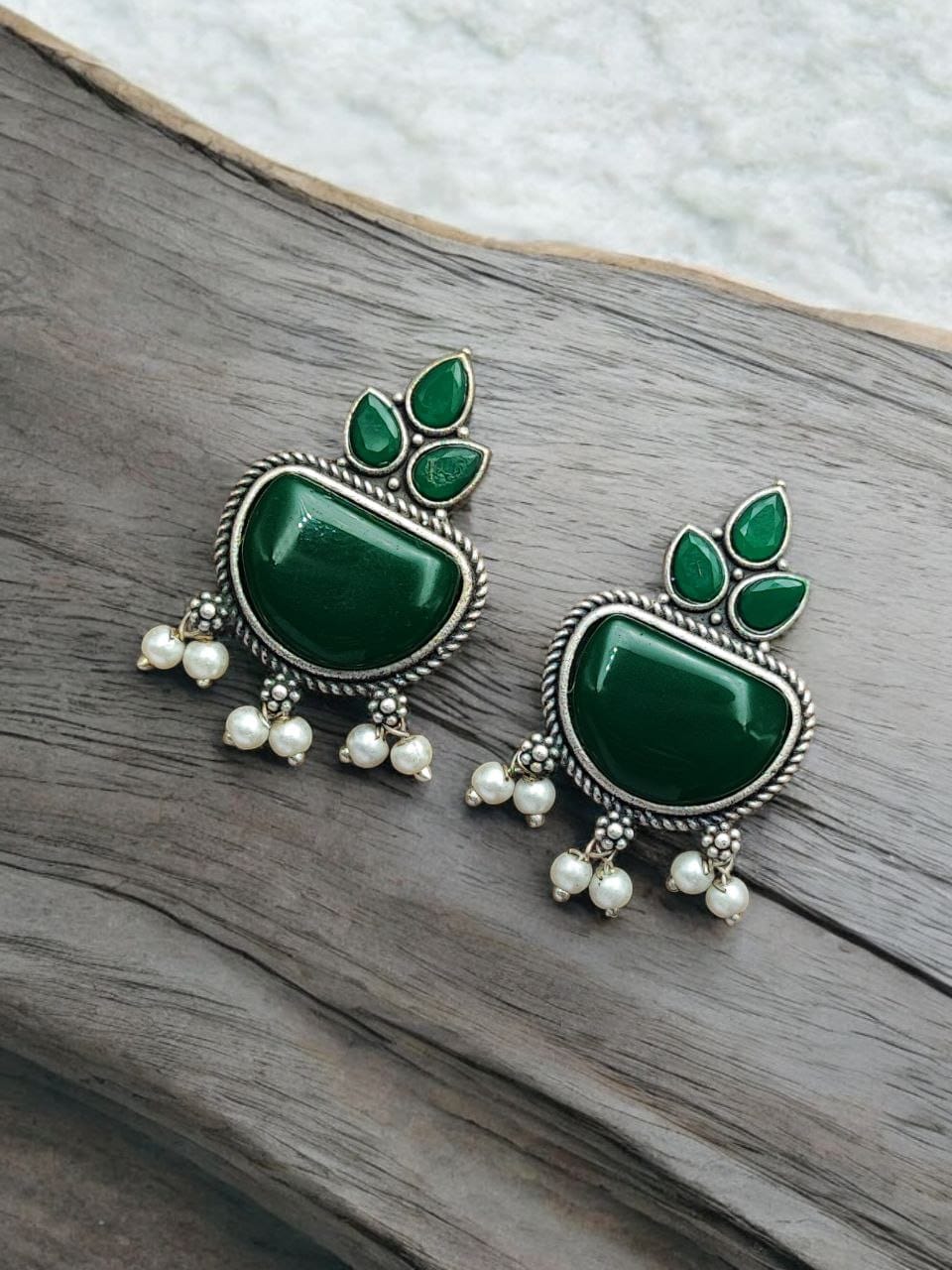 Green Traditional Indian Monalisa Stone Stud Tops Earring Ethnic Silver Oxidized Earring Set for Girls