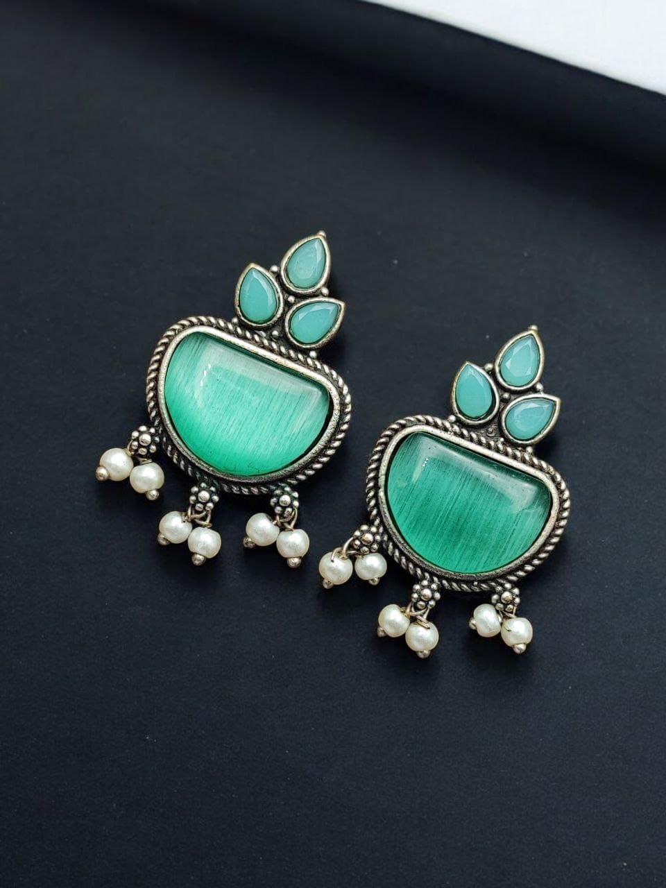 Mint Traditional Indian Monalisa Stone Stud Tops Earring Ethnic Silver Oxidized Earring Set for Girls