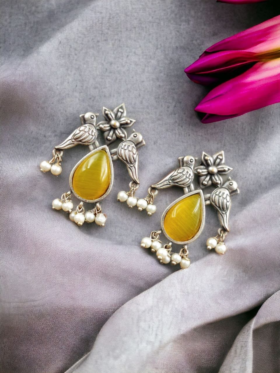 Yellow Dainty Birds Rustic Silver Oxidized Monalisa Stone Stud Earring Set with Pearl Beads Drop