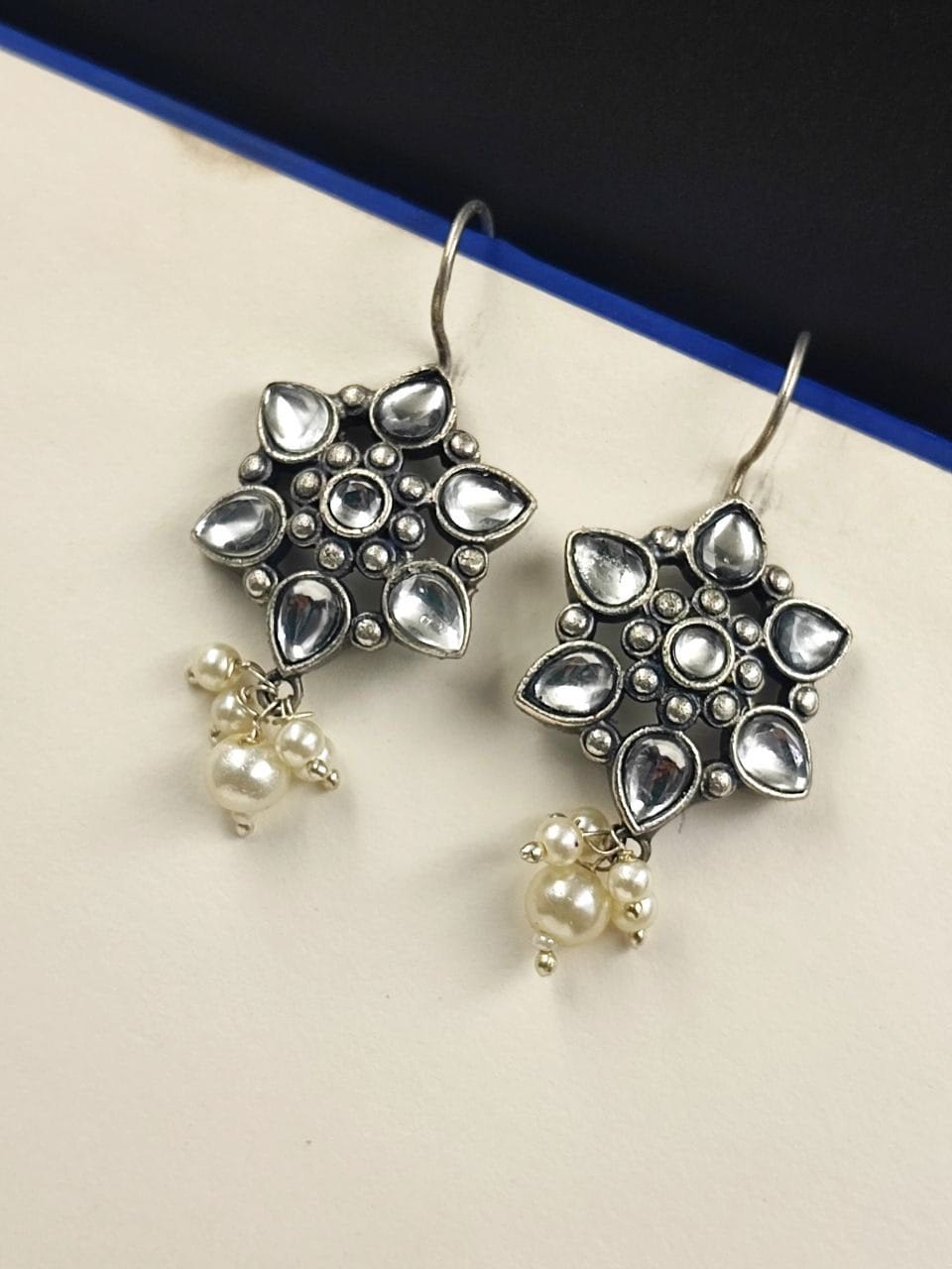 White Fashionable Silver-Toned Oxidized Brass Earring Hook Stonework Indian Earring Set Pearl Beads Drop