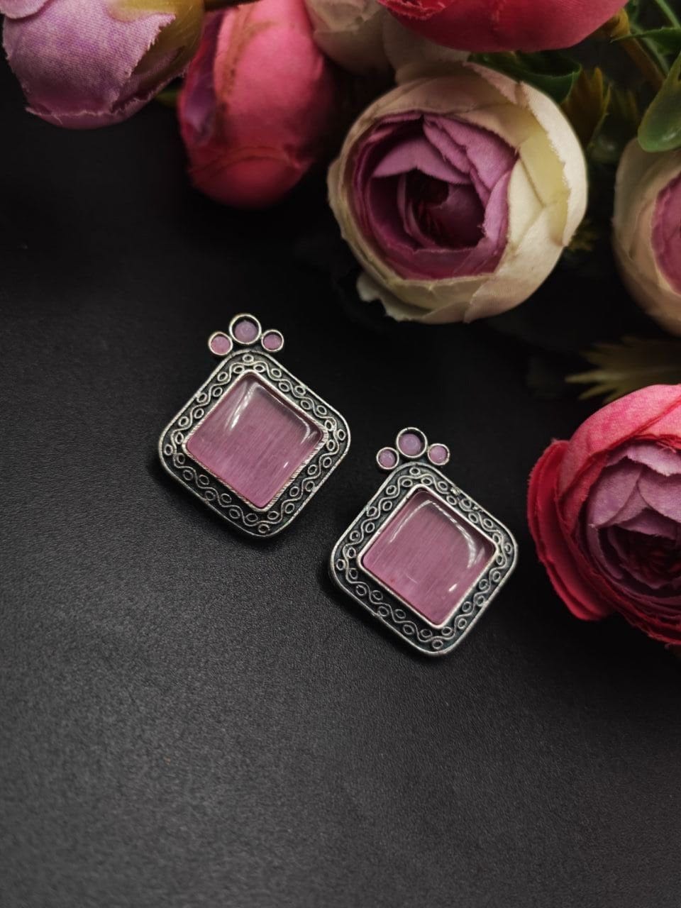 Baby Pink Elegant Square Monalisa Stone Stud Tops Earring Rustic Silver Oxidized Designer Earring Set