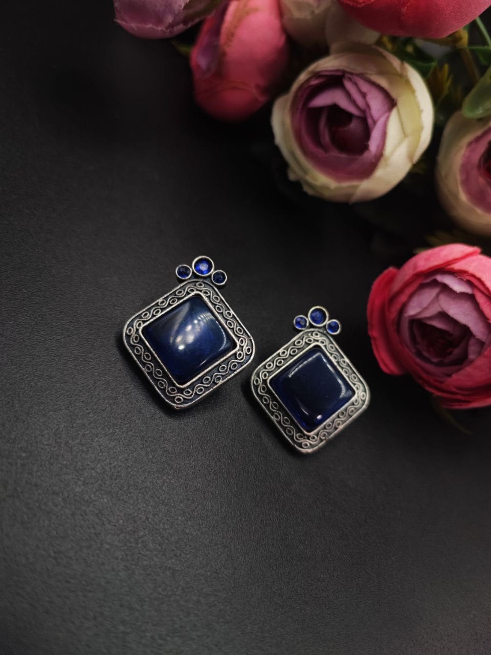 Blue Elegant Square Monalisa Stone Stud Tops Earring Rustic Silver Oxidized Designer Earring Set