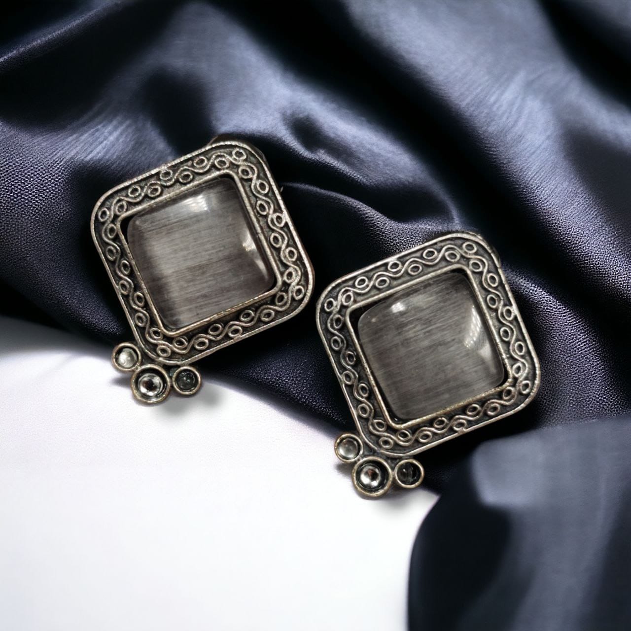 Grey Elegant Square Monalisa Stone Stud Tops Earring Rustic Silver Oxidized Designer Earring Set