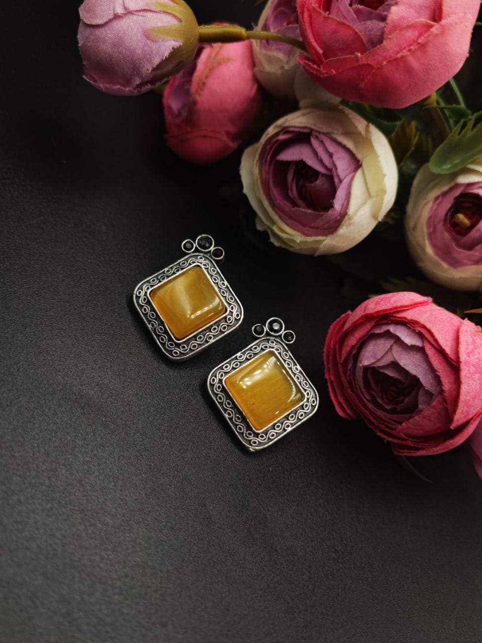 Yellow Elegant Square Monalisa Stone Stud Tops Earring Rustic Silver Oxidized Designer Earring Set