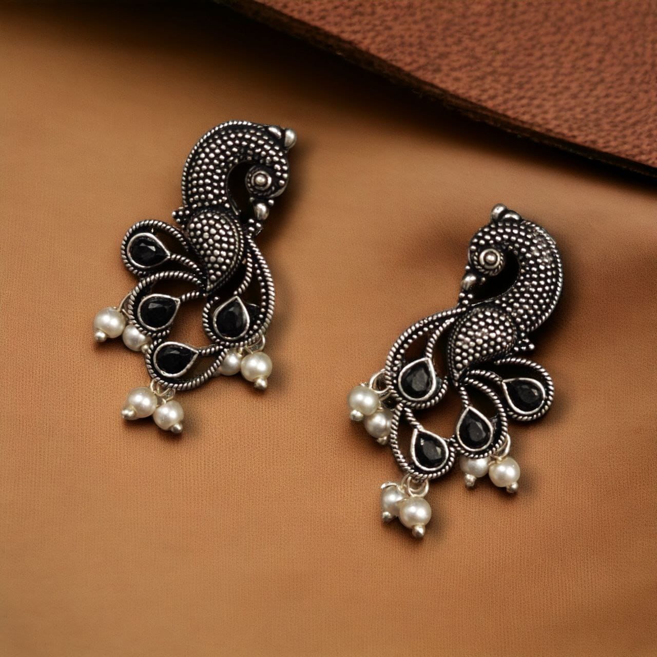 Black Ethnic Indian Peacock Designer Silver Oxidized Rustic Stonework Stud Earring with Pearl Beads Drop