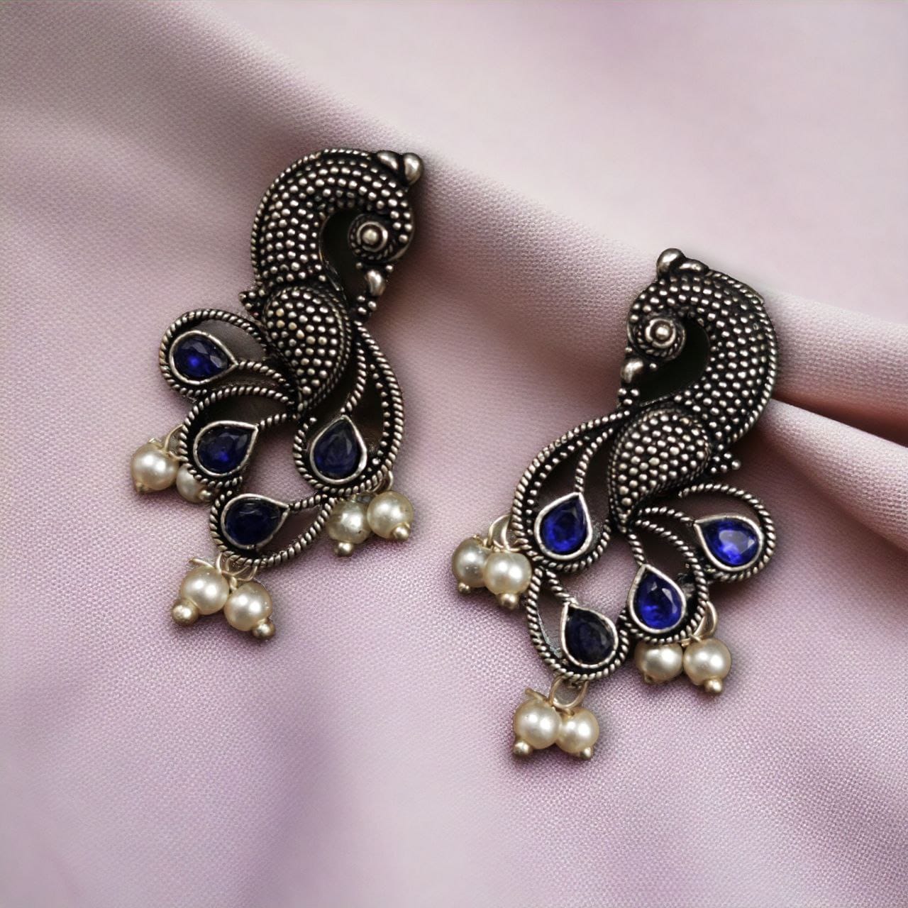 Blue Ethnic Indian Peacock Designer Silver Oxidized Rustic Stonework Stud Earring with Pearl Beads Drop
