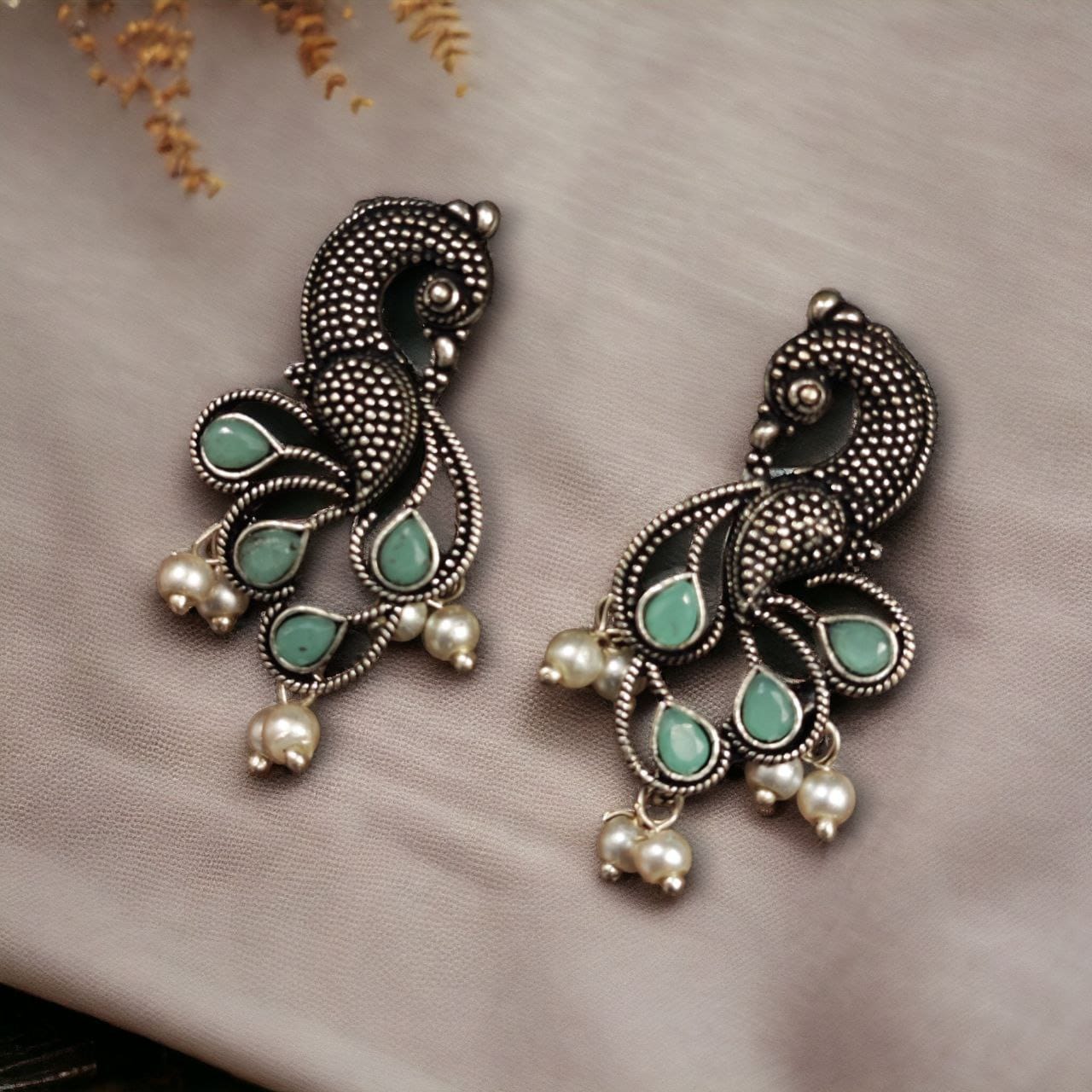 Mint Ethnic Indian Peacock Designer Silver Oxidized Rustic Stonework Stud Earring with Pearl Beads Drop