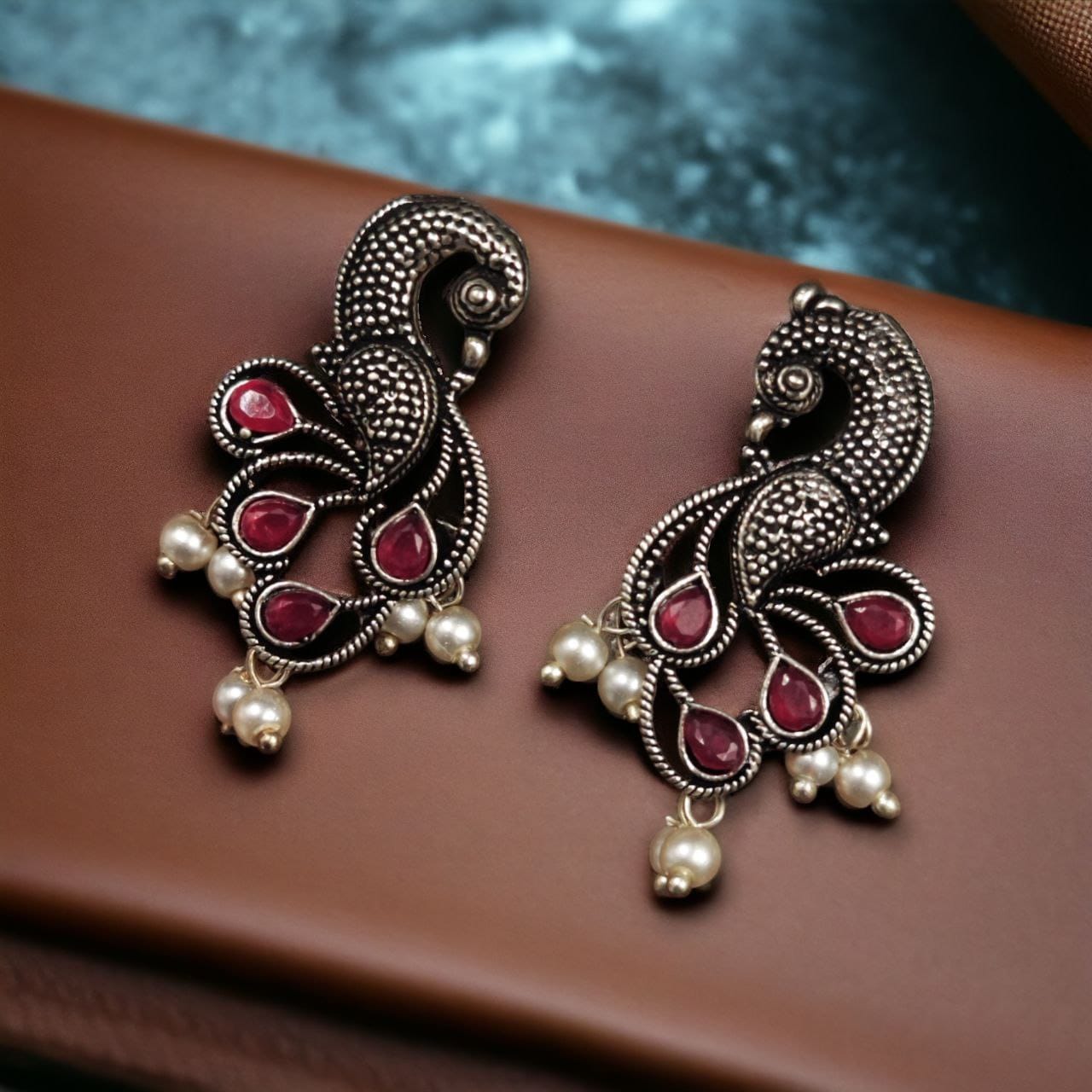 Red Ethnic Indian Peacock Designer Silver Oxidized Rustic Stonework Stud Earring with Pearl Beads Drop