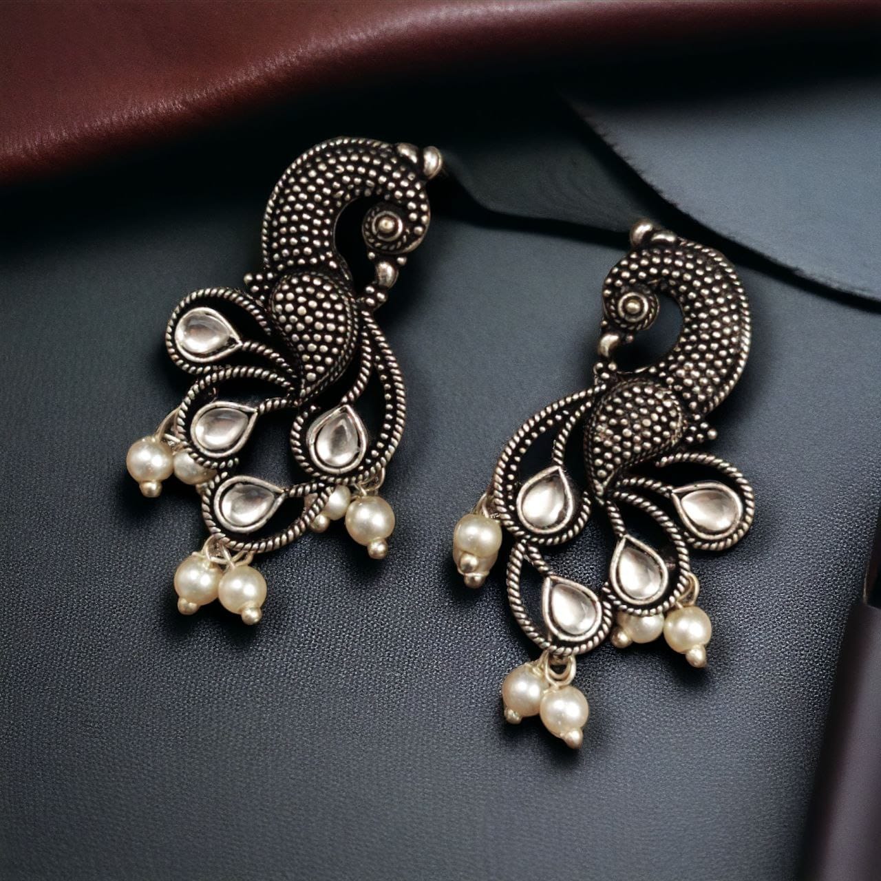 Ethnic Indian Peacock Designer Silver Oxidized Rustic Stonework Stud Earring with Pearl Beads Drop