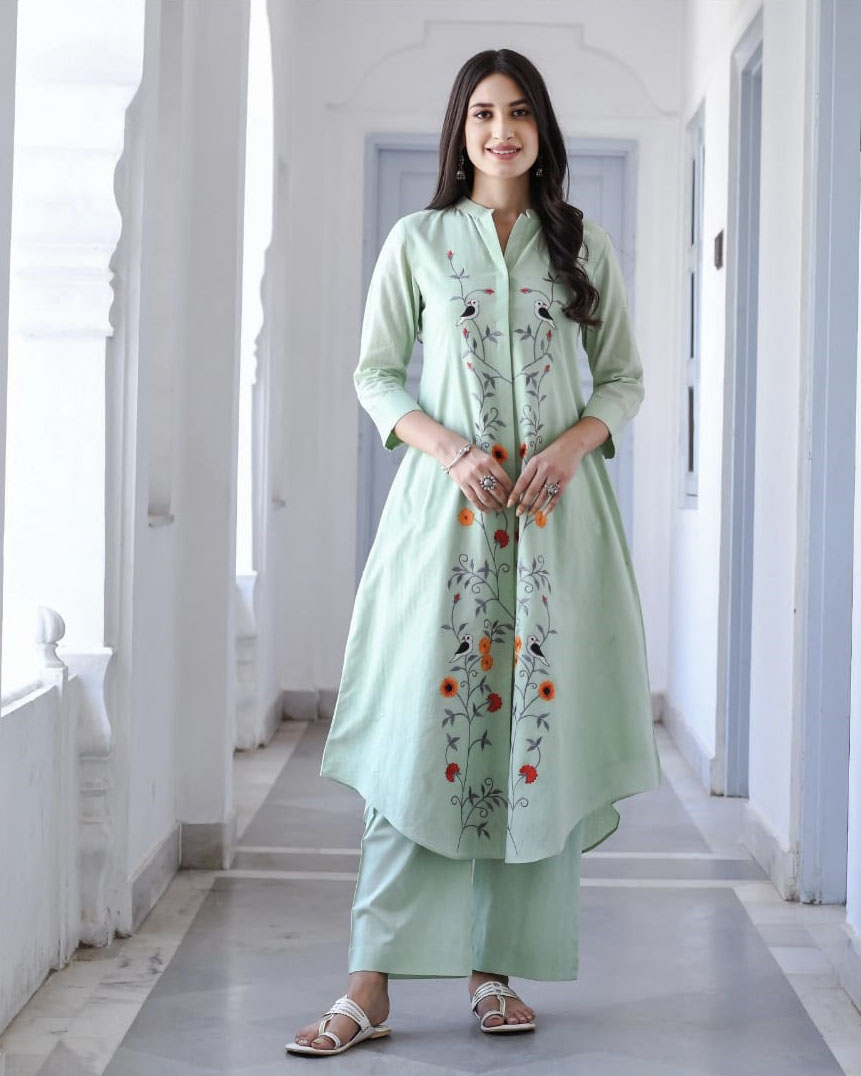 Product LinkGreen New Trendy Katha Cotton Co-ord Set Kurti with Pocket Palazzo Pant Set Online Aline Dress
