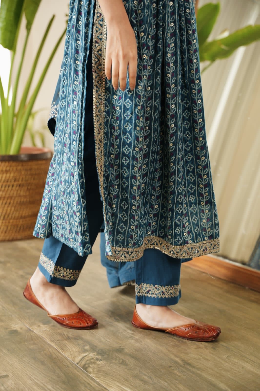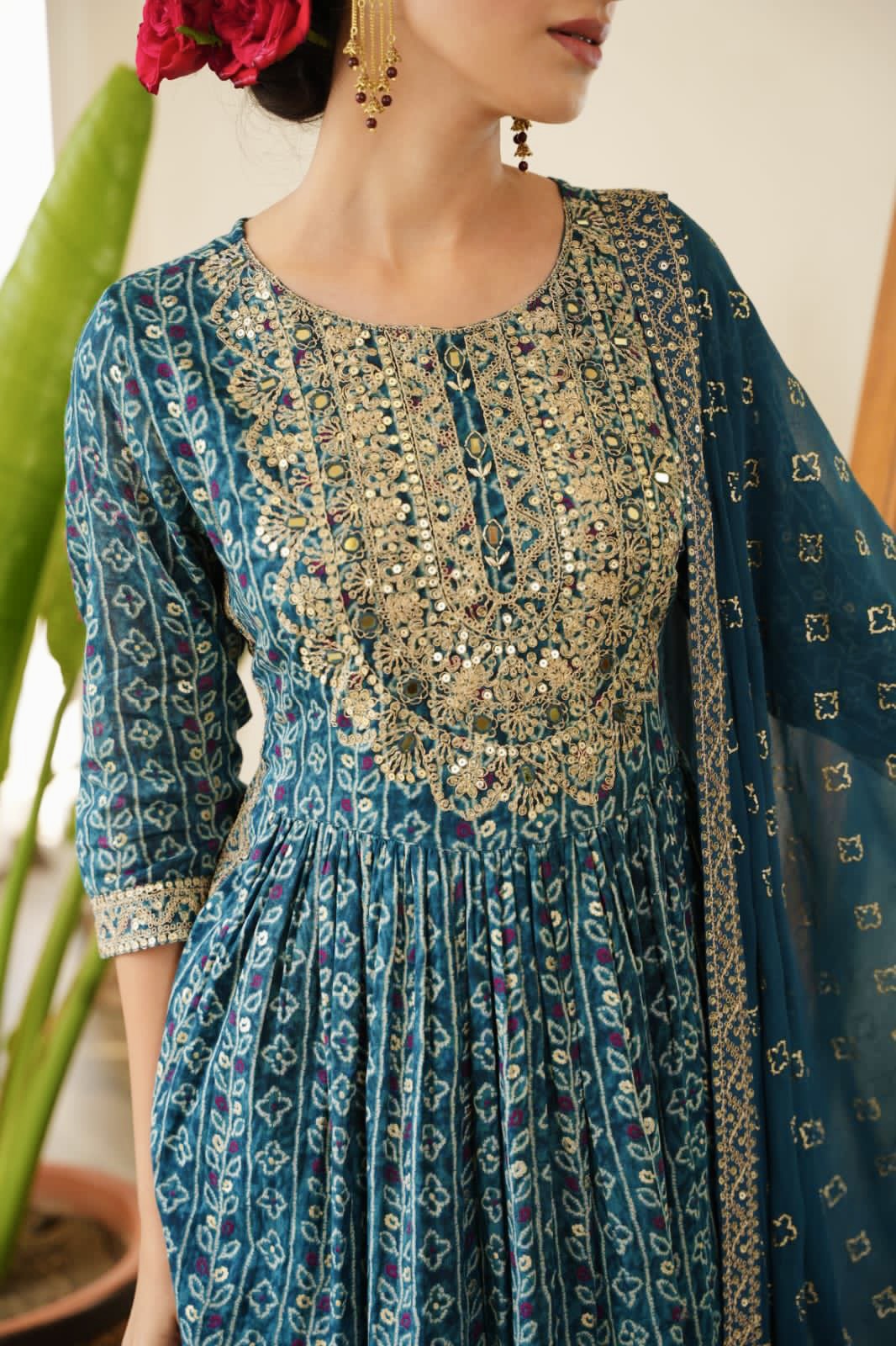 Blue Embroidered Printed Indian Pakistani Naira Cut Salwar Kameez Kurti Pant Dupatta Set Kurta Set Online for Women
