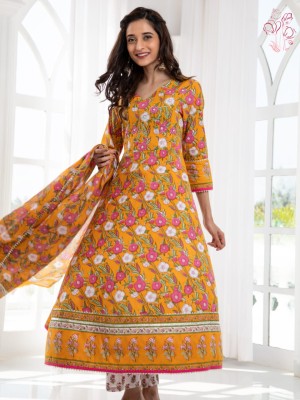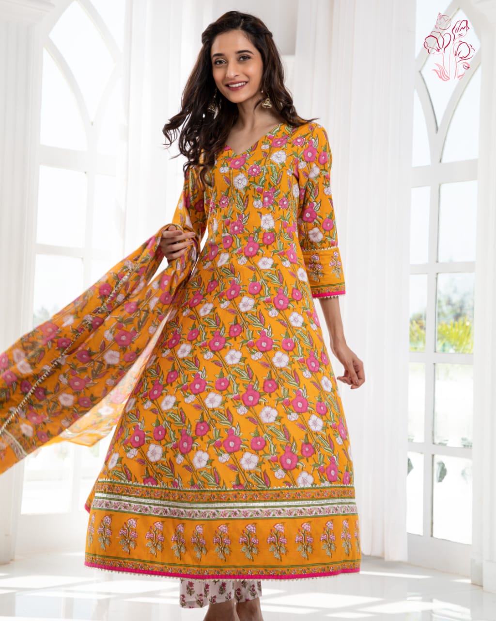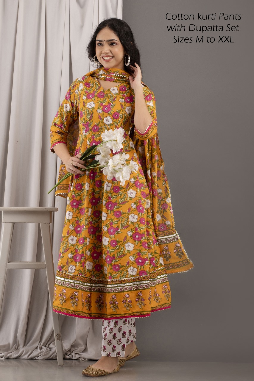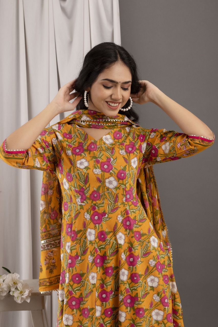 Sohna Yellow Block Printed Indian Salwar Kameez Anarkali Kurti Pant Dupatta Set for Women
