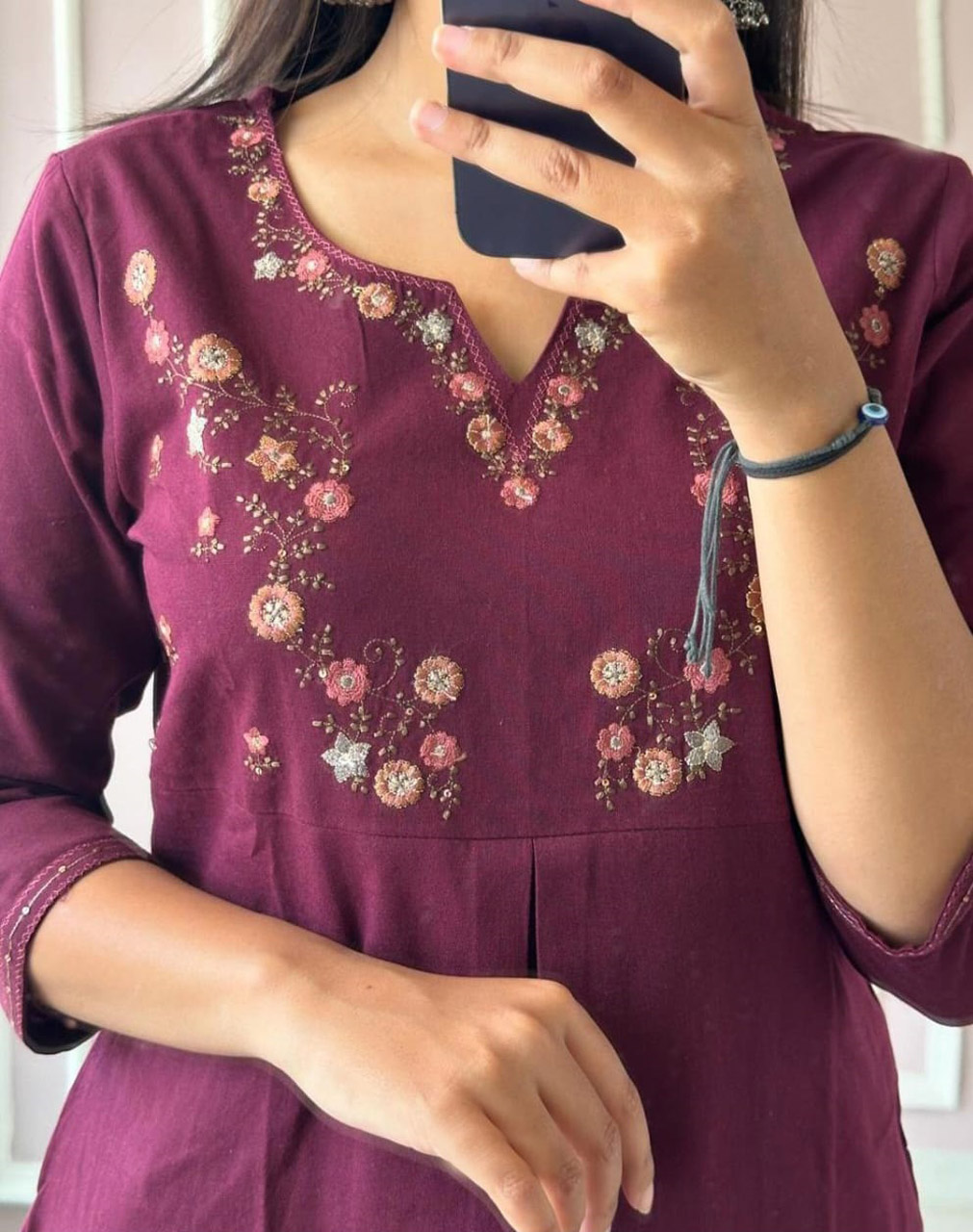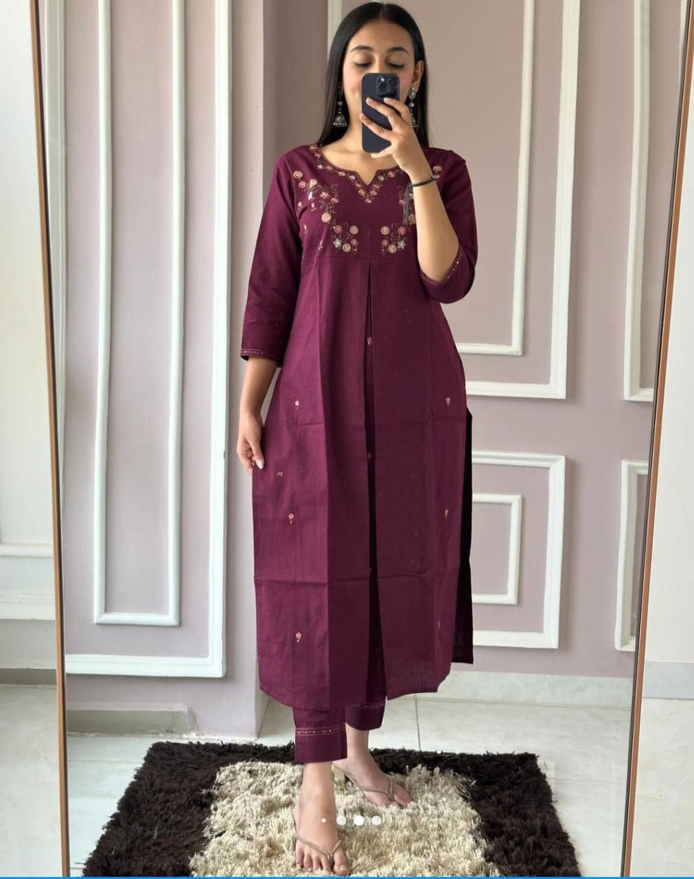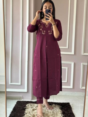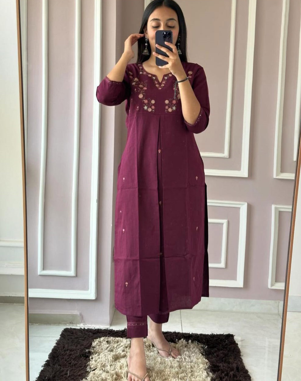 Wine Straight Kurti Pant Set Embroidered Salwar Kameez for Women