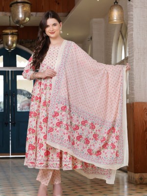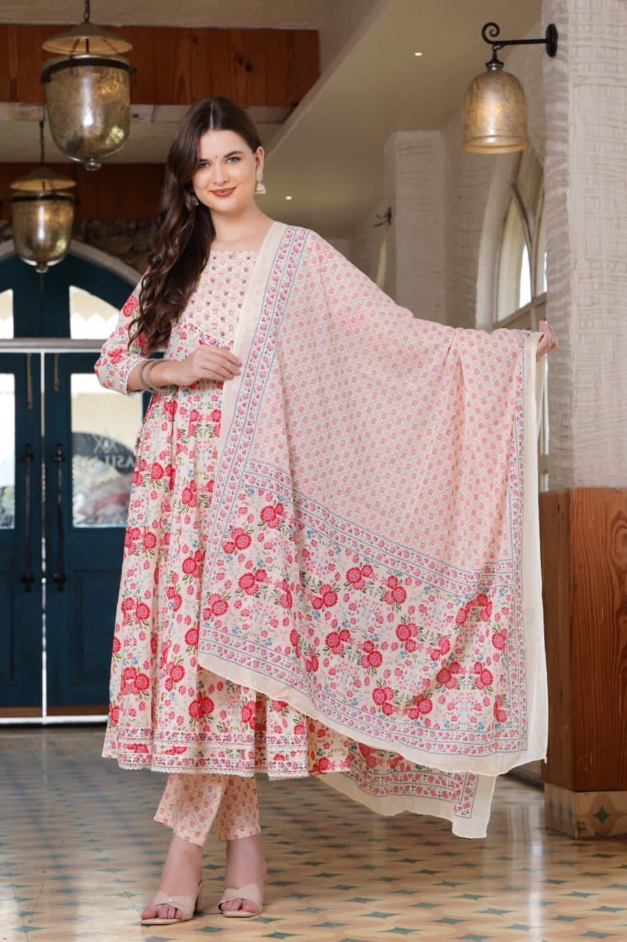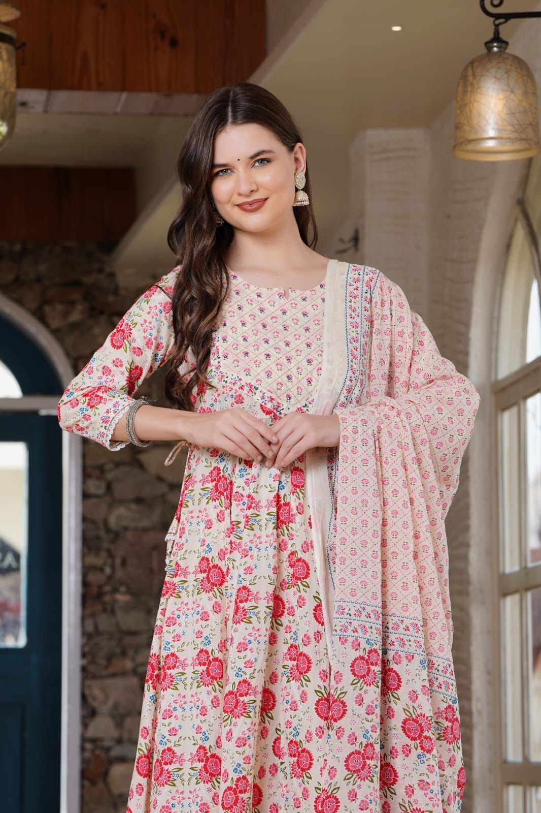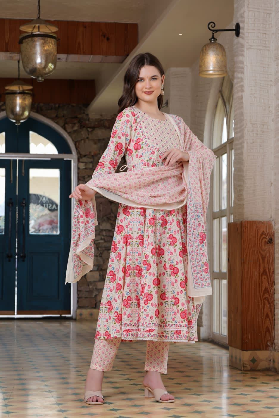 Cream Color Women Flared Anarkali Frock Style Kurti Pant Dupatta Set Dress Floral Printed Gown