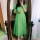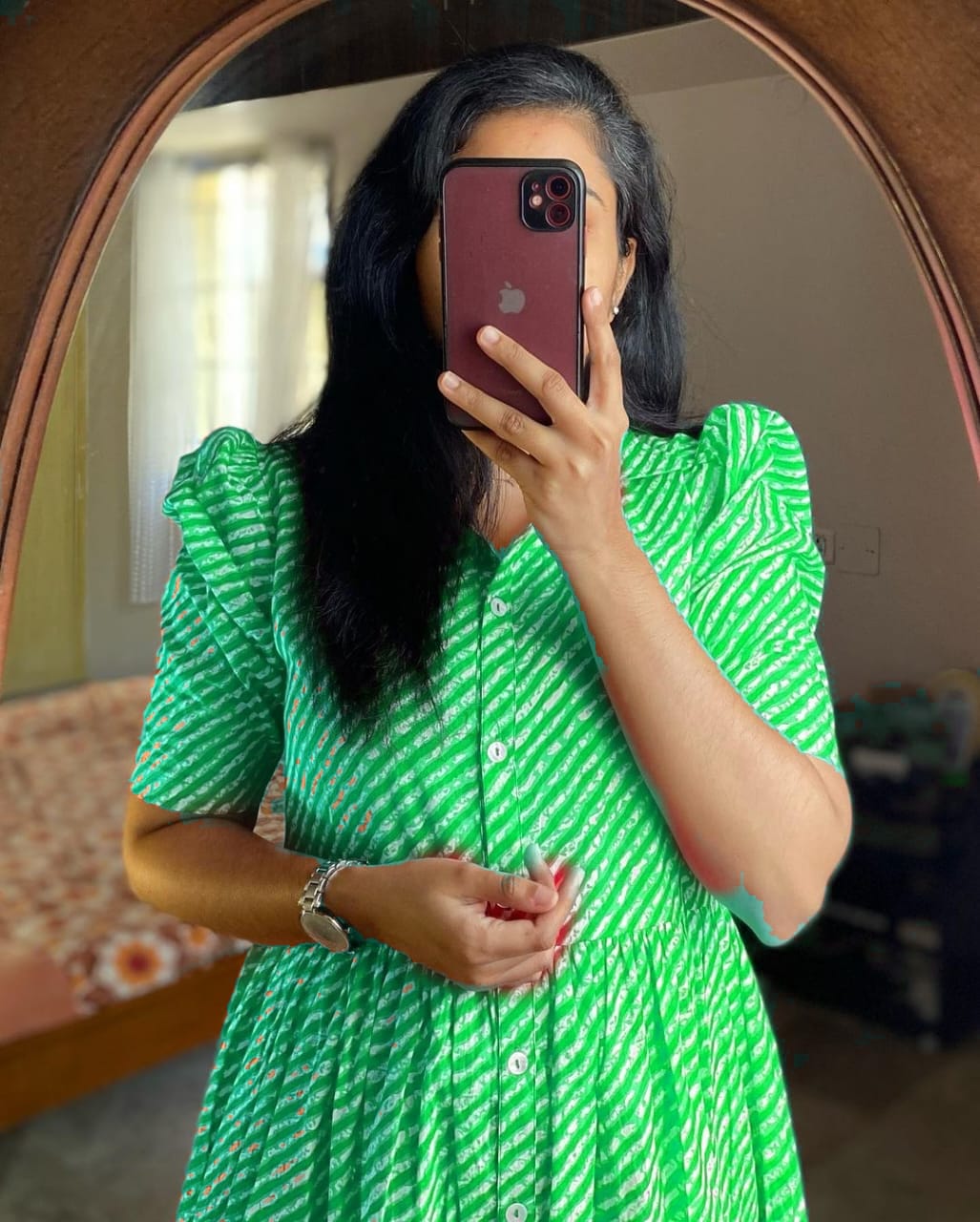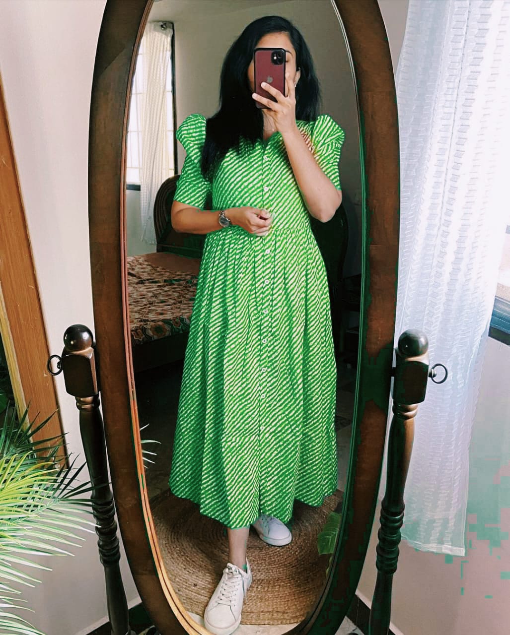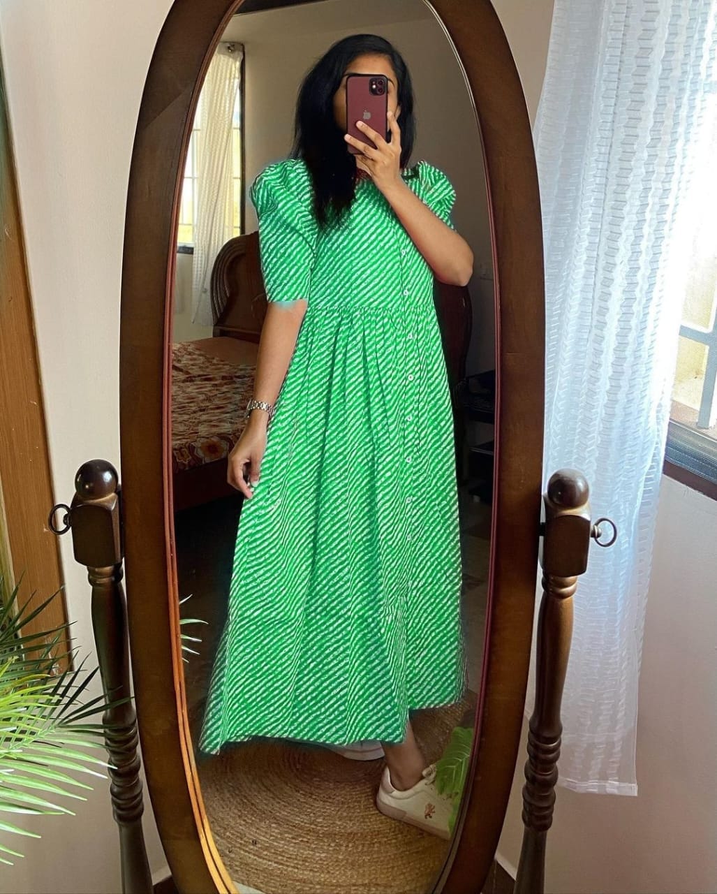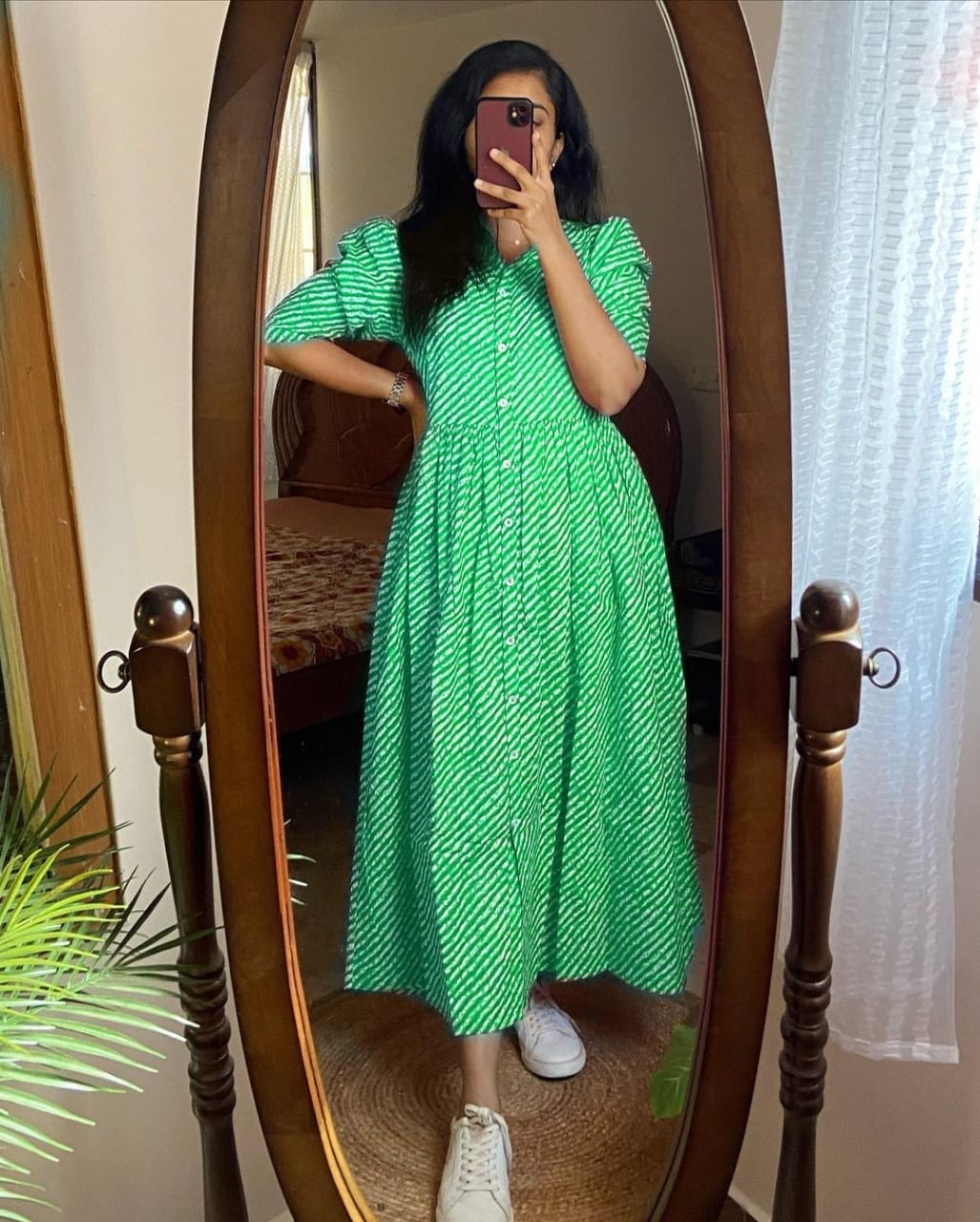 Green Office Wear Lehariya Print Middi Frock Style Puff Sleeves Kurti Saavan Dress for Women
