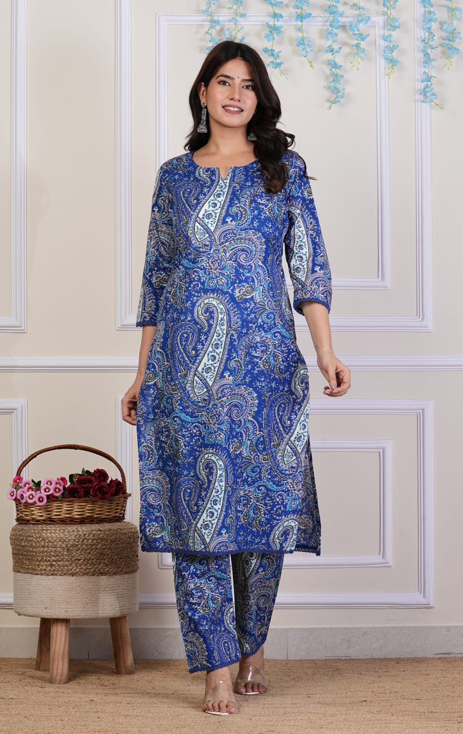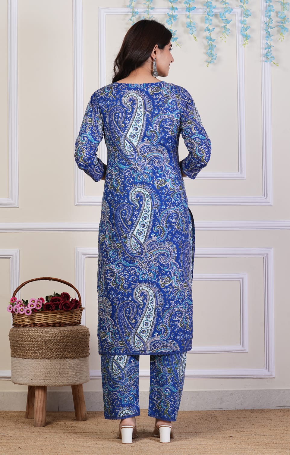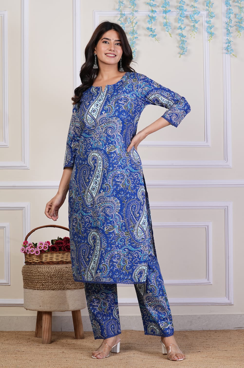 Blue Paisley Floral Print Straight Kurti Pant Co Ord Set Embroidered Salwar Kameez for Women