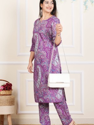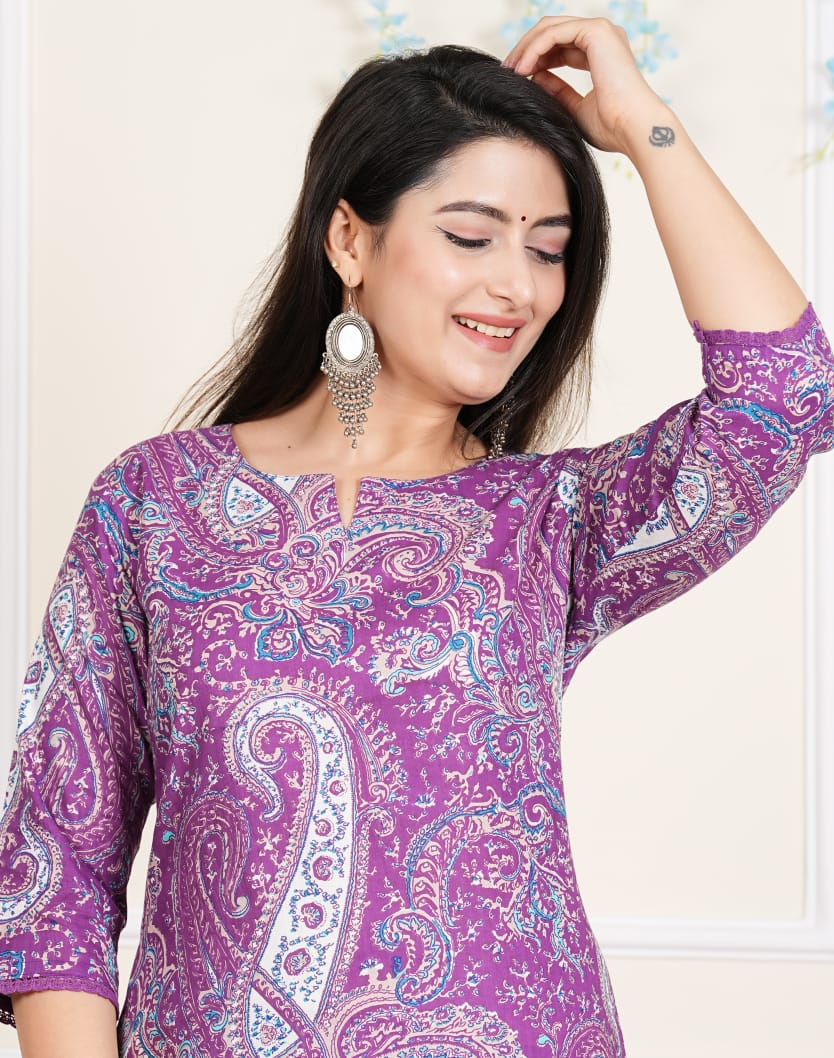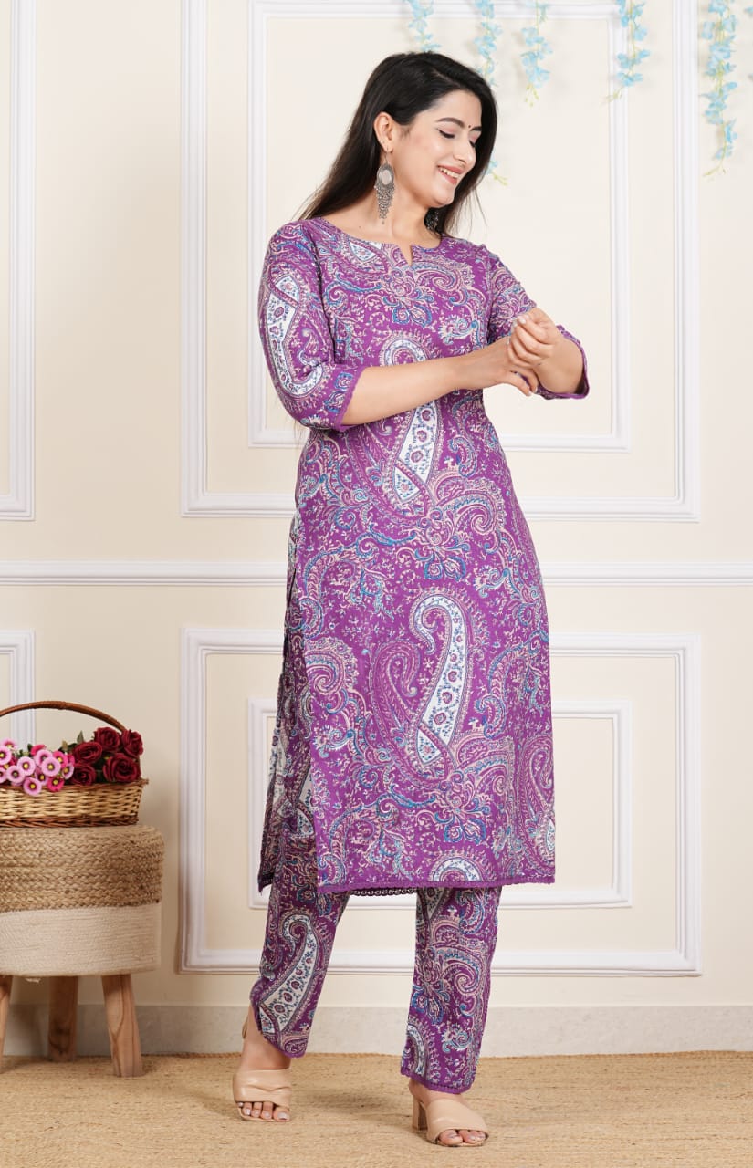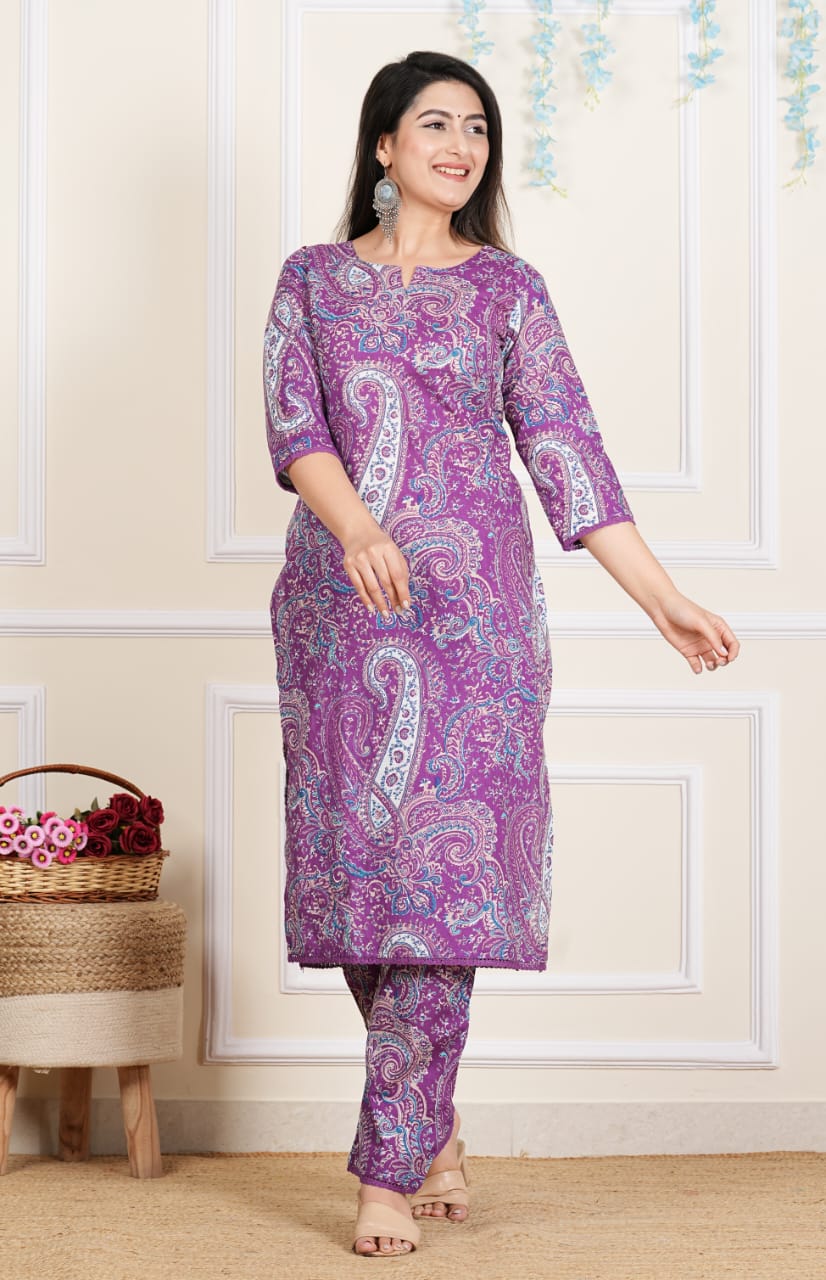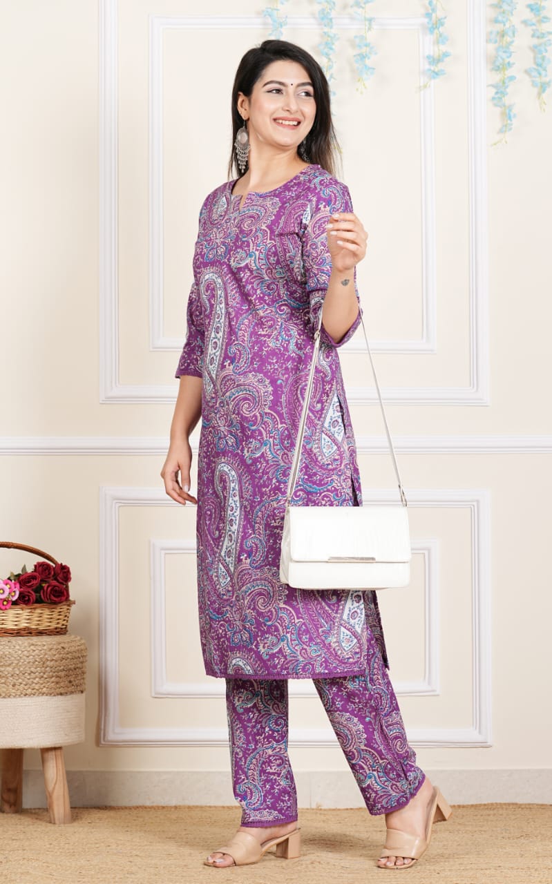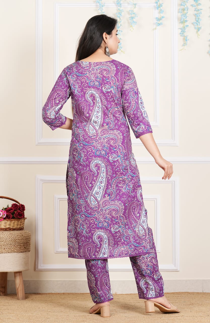 Purple Paisley Floral Print Straight Kurti Pant Co Ord Set Embroidered Salwar Kameez for Women