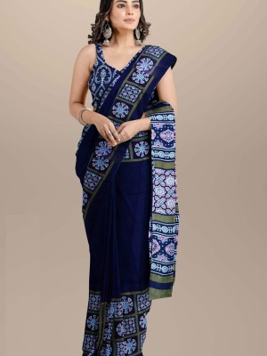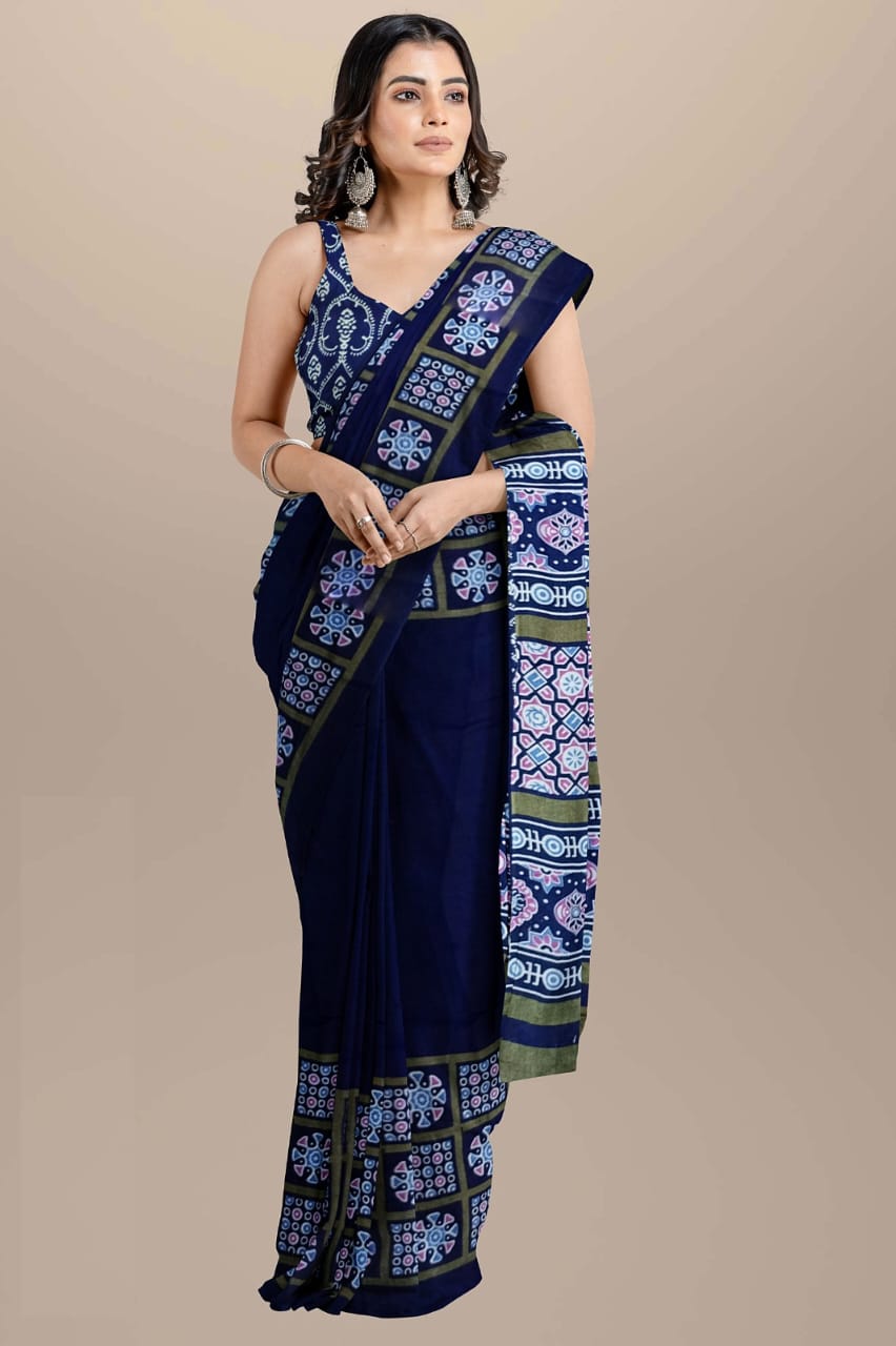 Pretty Dark Blue Mulmul Cotton Saree Hand Block Printed with Blouse Piece for Women