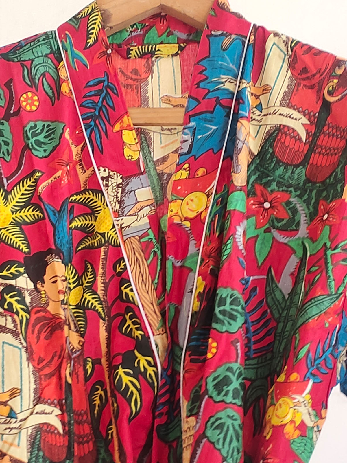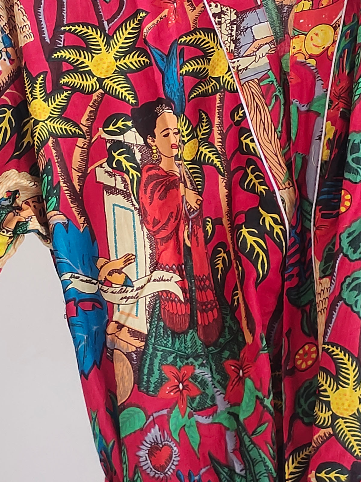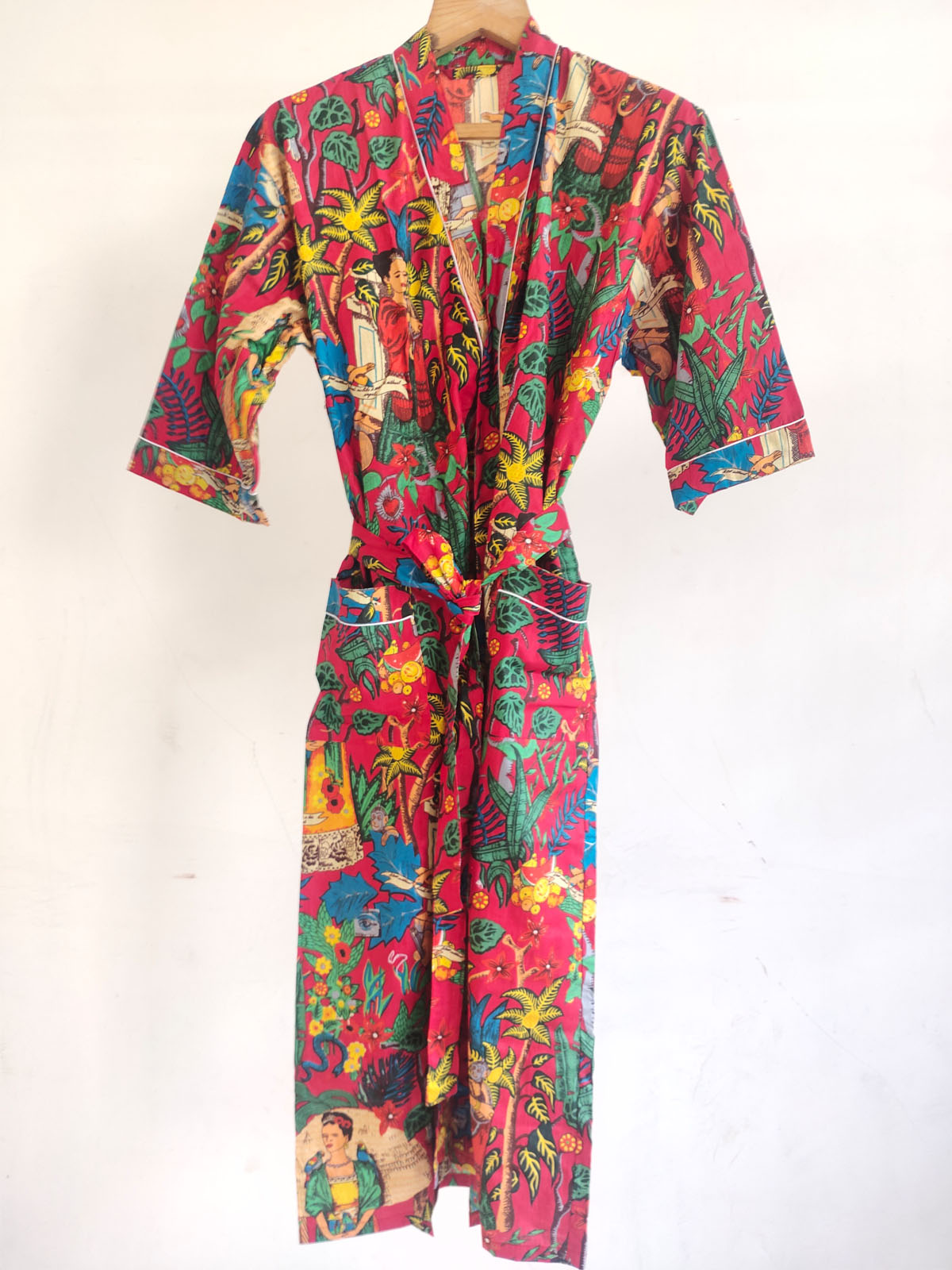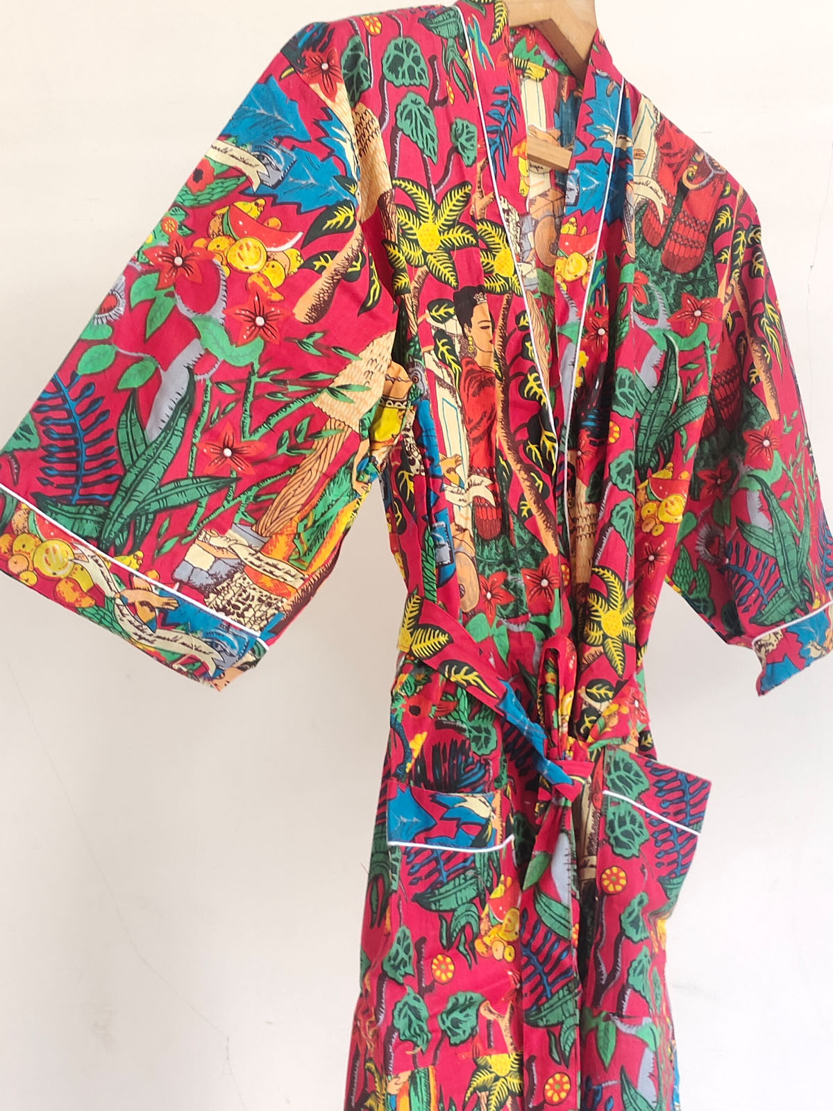 • Pink Frida Kahlo Pure Cotton Kimono Indian Handprinted Boho Robe Summer Dress Beach Coverup