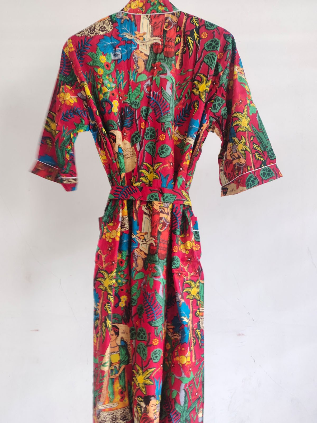 Red Frida Kahlo Pure Cotton Kimono Indian Handprinted Boho Robe Summer Dress Beach Coverup
