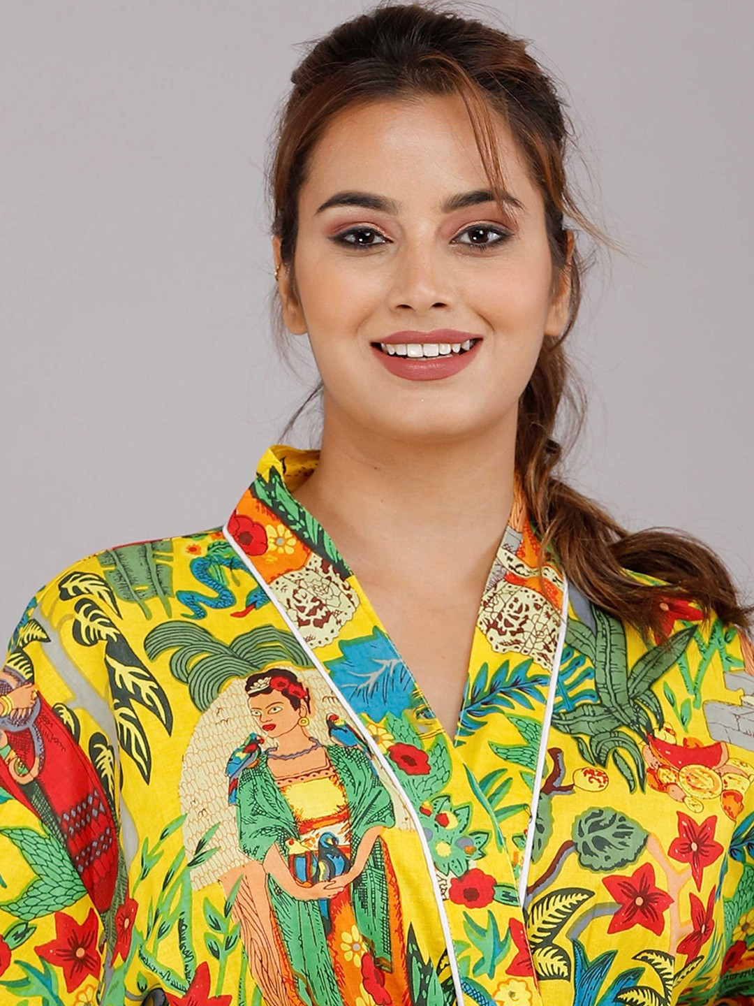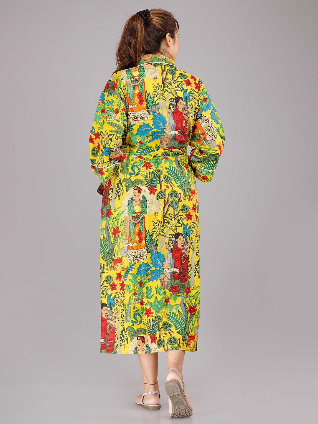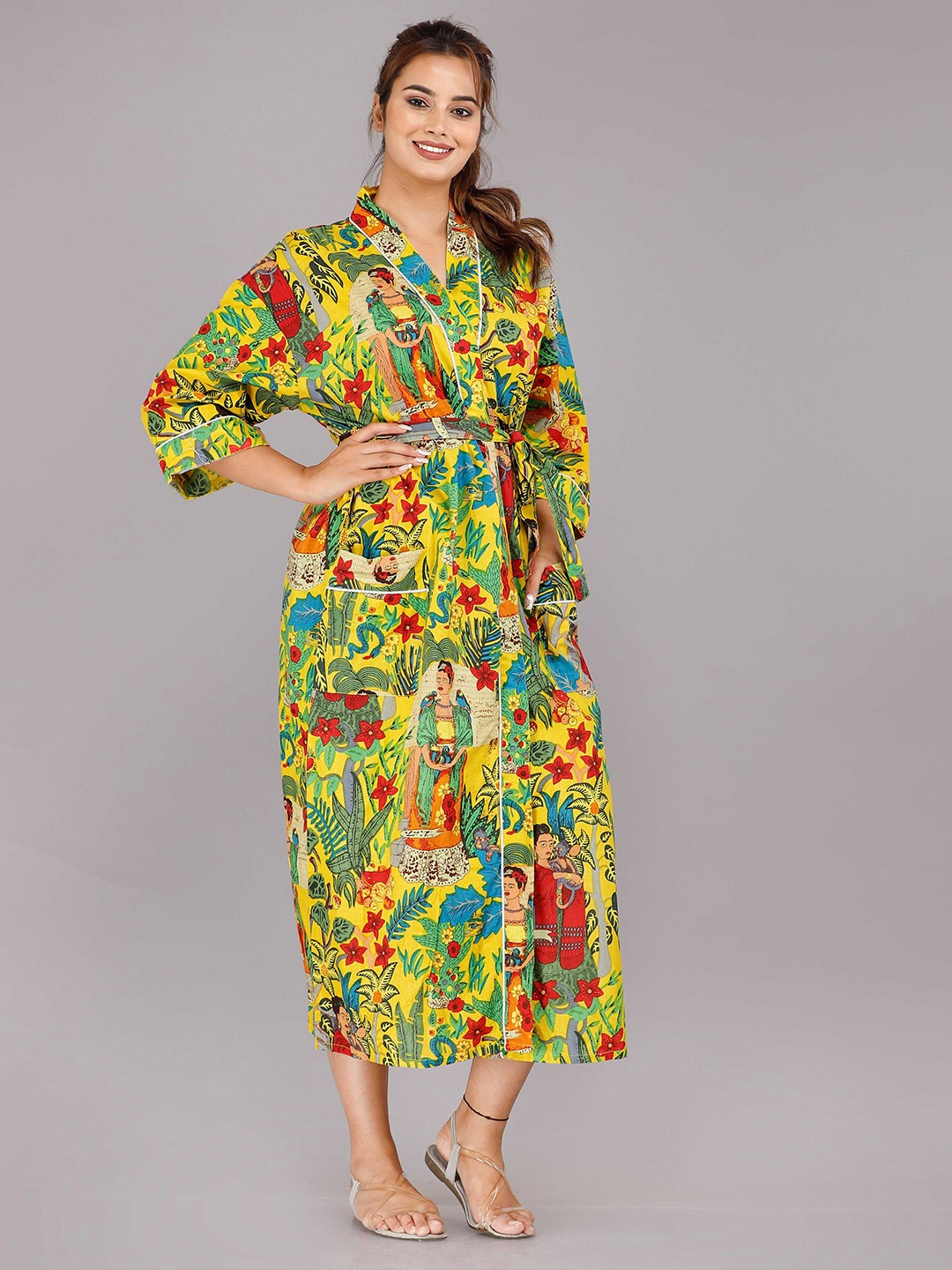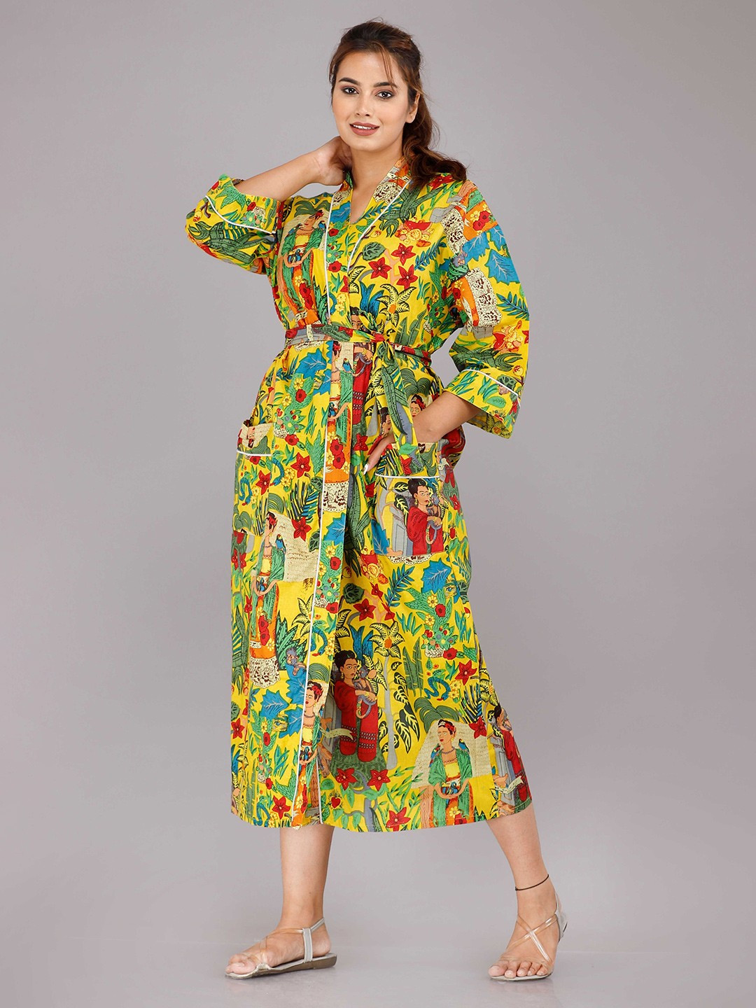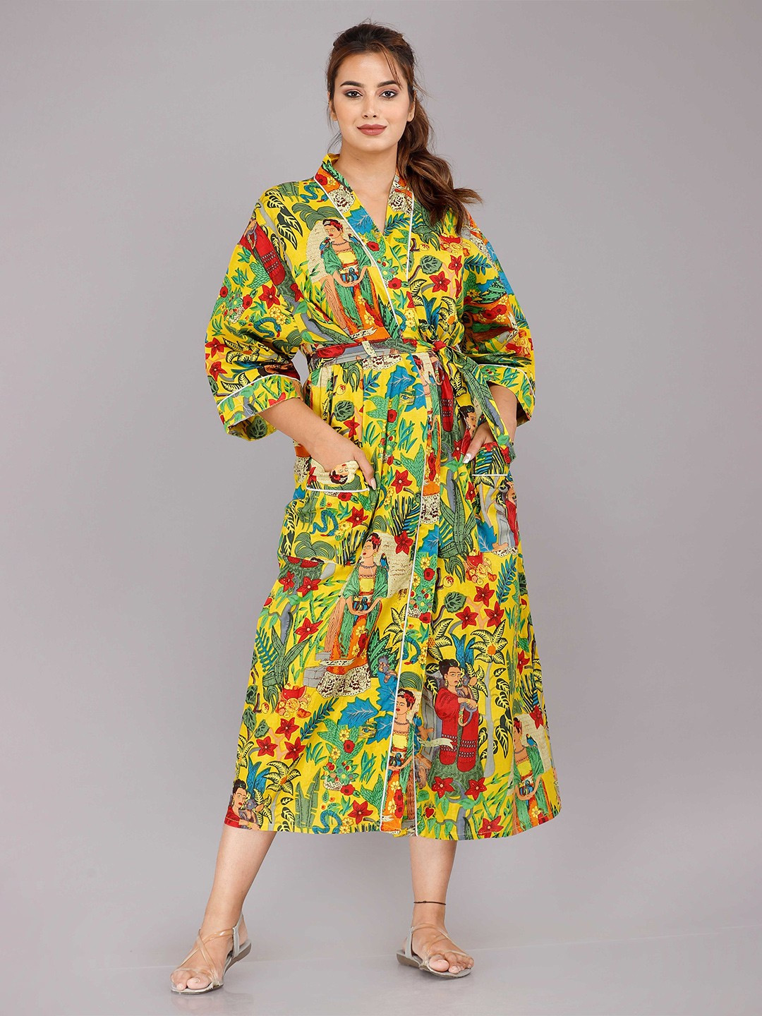 Yellow Frida Kahlo Pure Cotton Kimono Indian Handprinted Boho Robe Summer Dress Beach Coverup