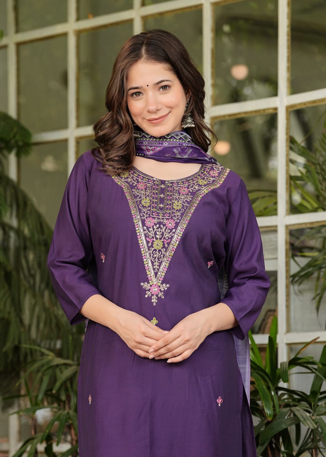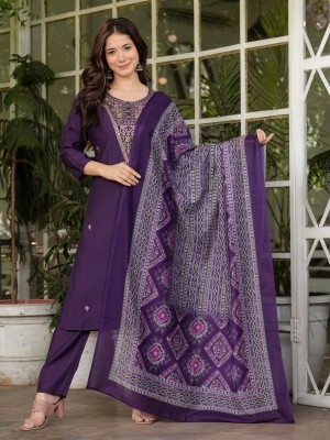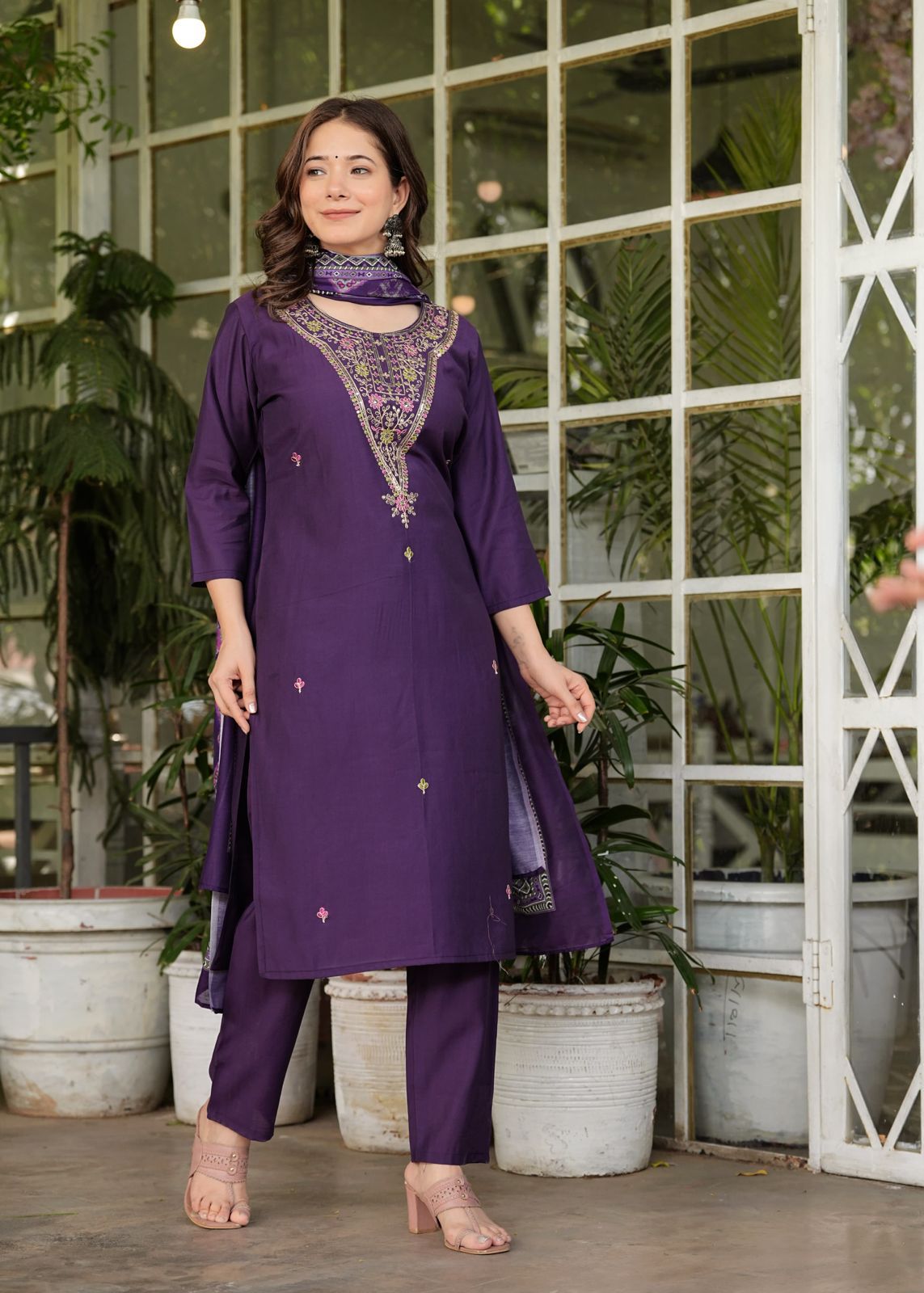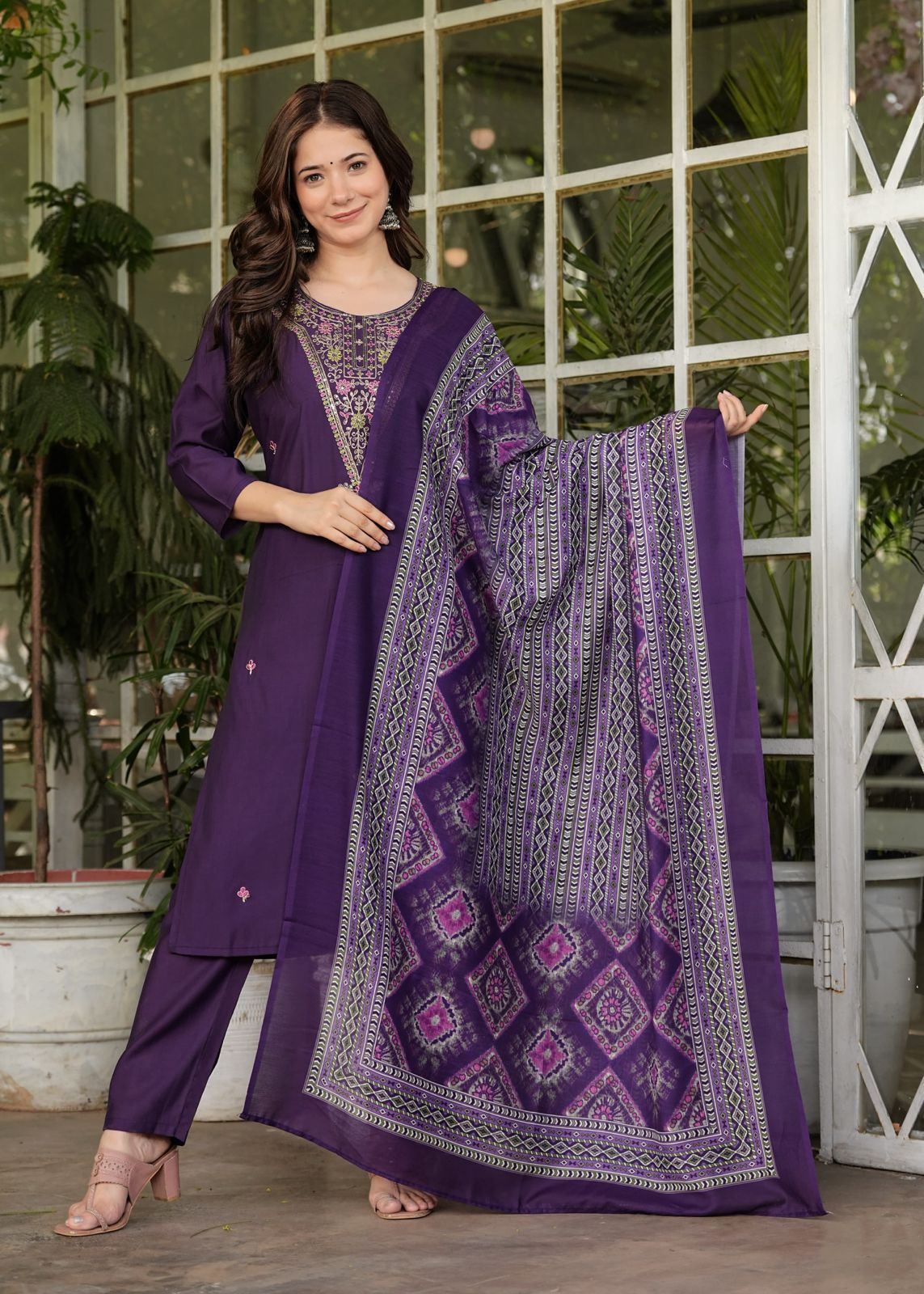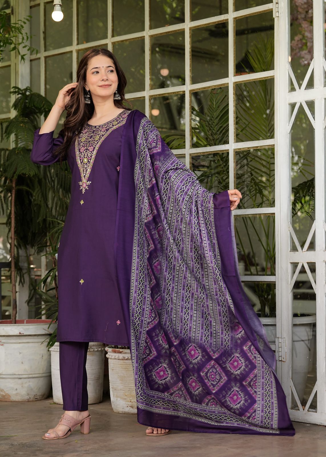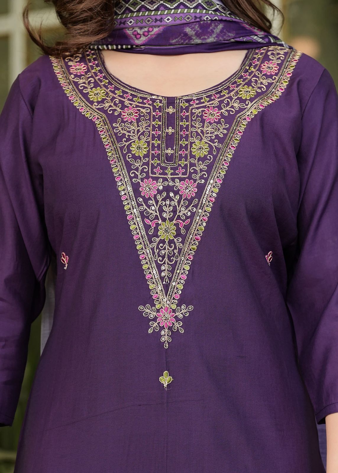 Purple Traditional Party Wear Indian Straight Silk Salwar Kameez Kurti Pant Dupatta Set