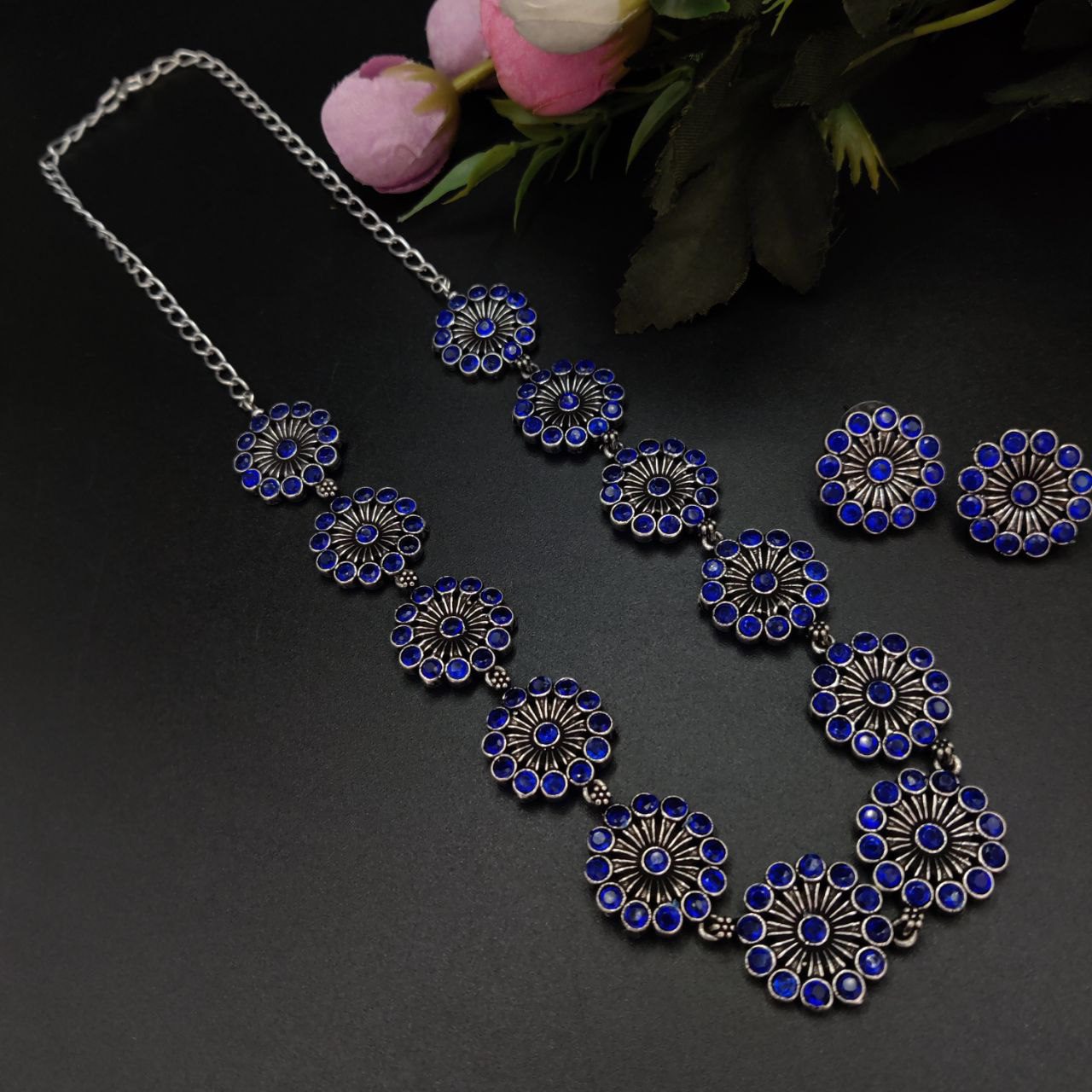 Blue Beautiful Oxidised Silver Brass Stone Work Choker Necklace with Earring Jewellery Set