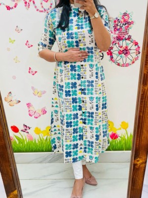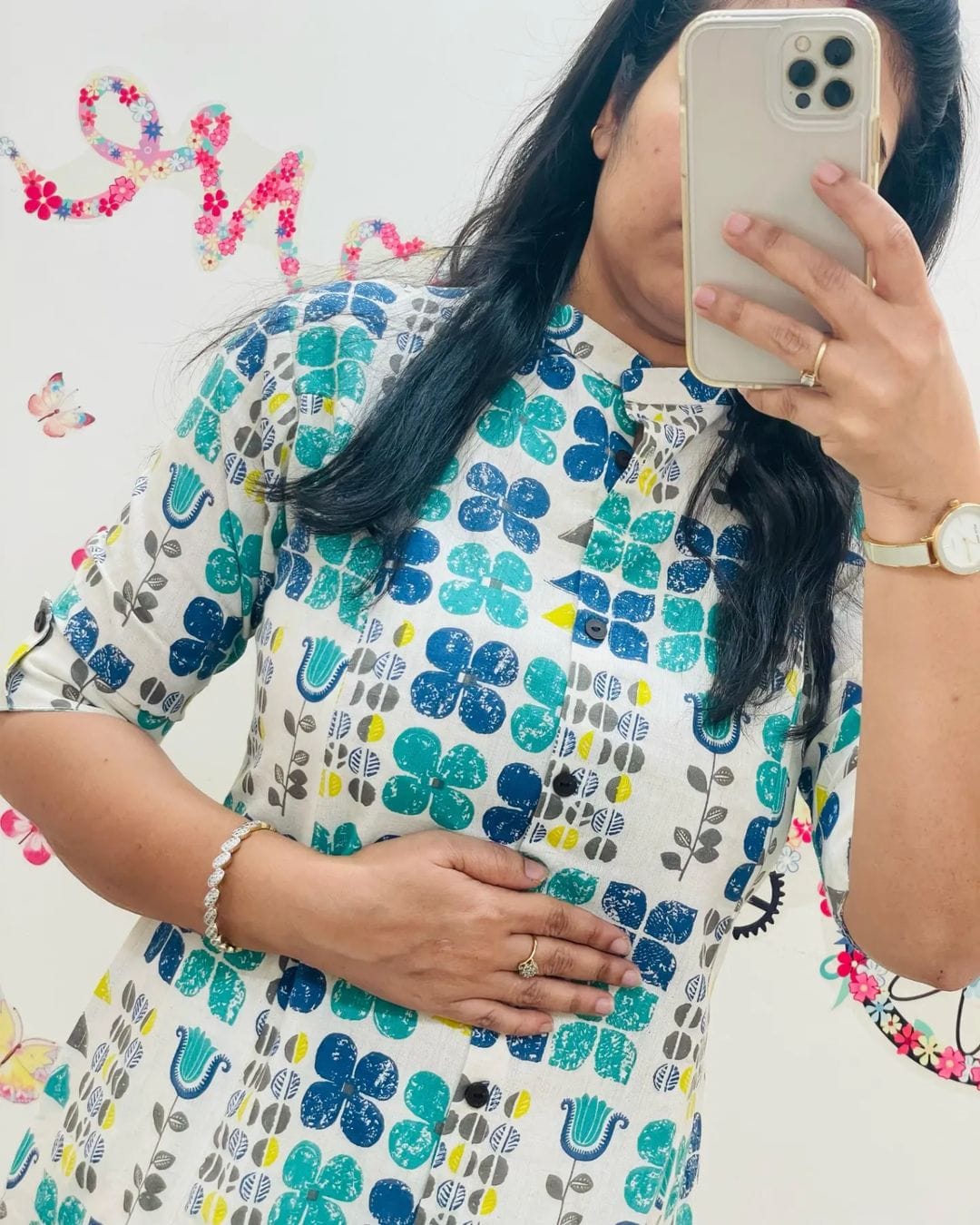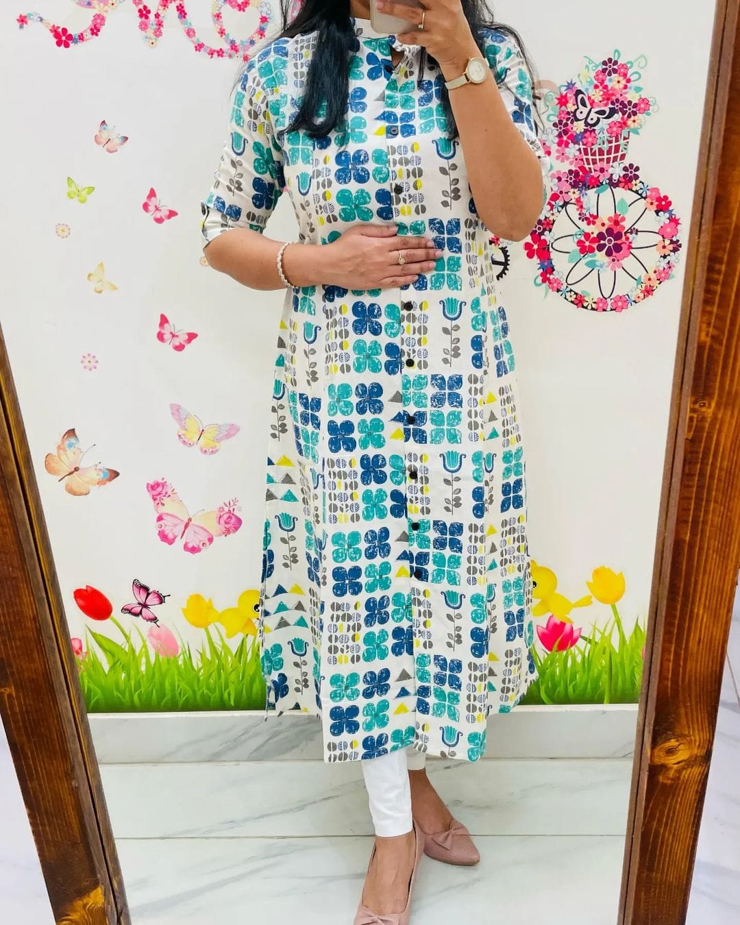 Blue Floral Printed Indian Cotton Salwar Kameez A line Kurti Pant Co Ord Set
