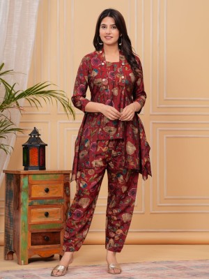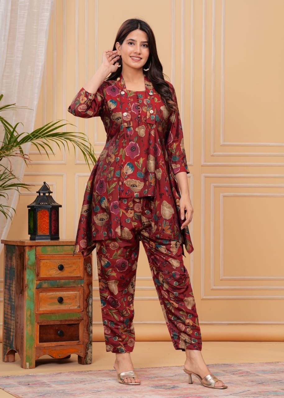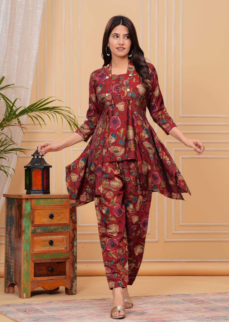 Red Muslin Soft Fabric Indian Salwar Kameez Kurti Pant Jacket Co Ord Set