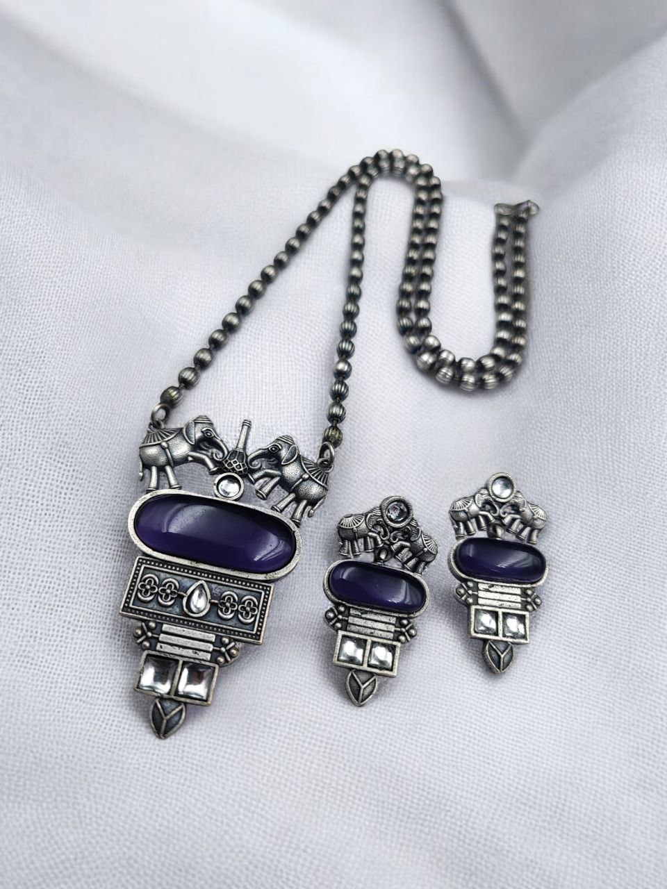 Amethyst Indian Elephant Designer Oxidized Silver Monalisa Stone Necklace Chain Pendant with Earring Set