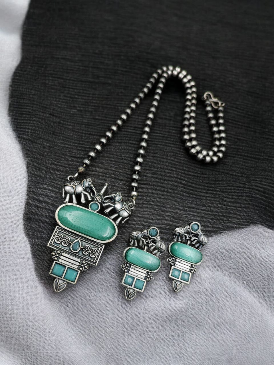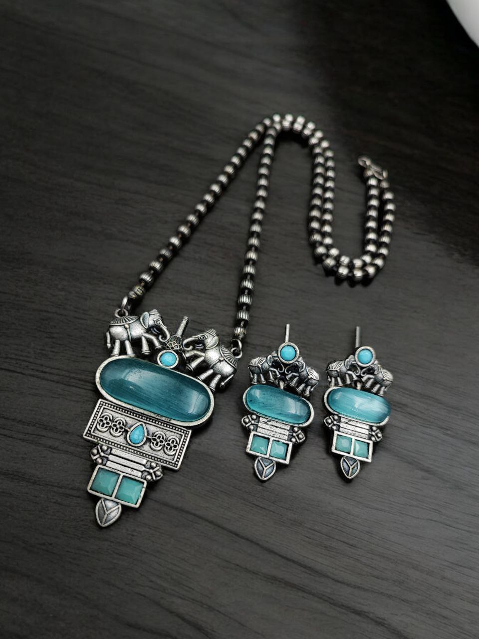 Aqua Indian Elephant Designer Oxidized Silver Monalisa Stone Necklace Chain Pendant with Earring Set