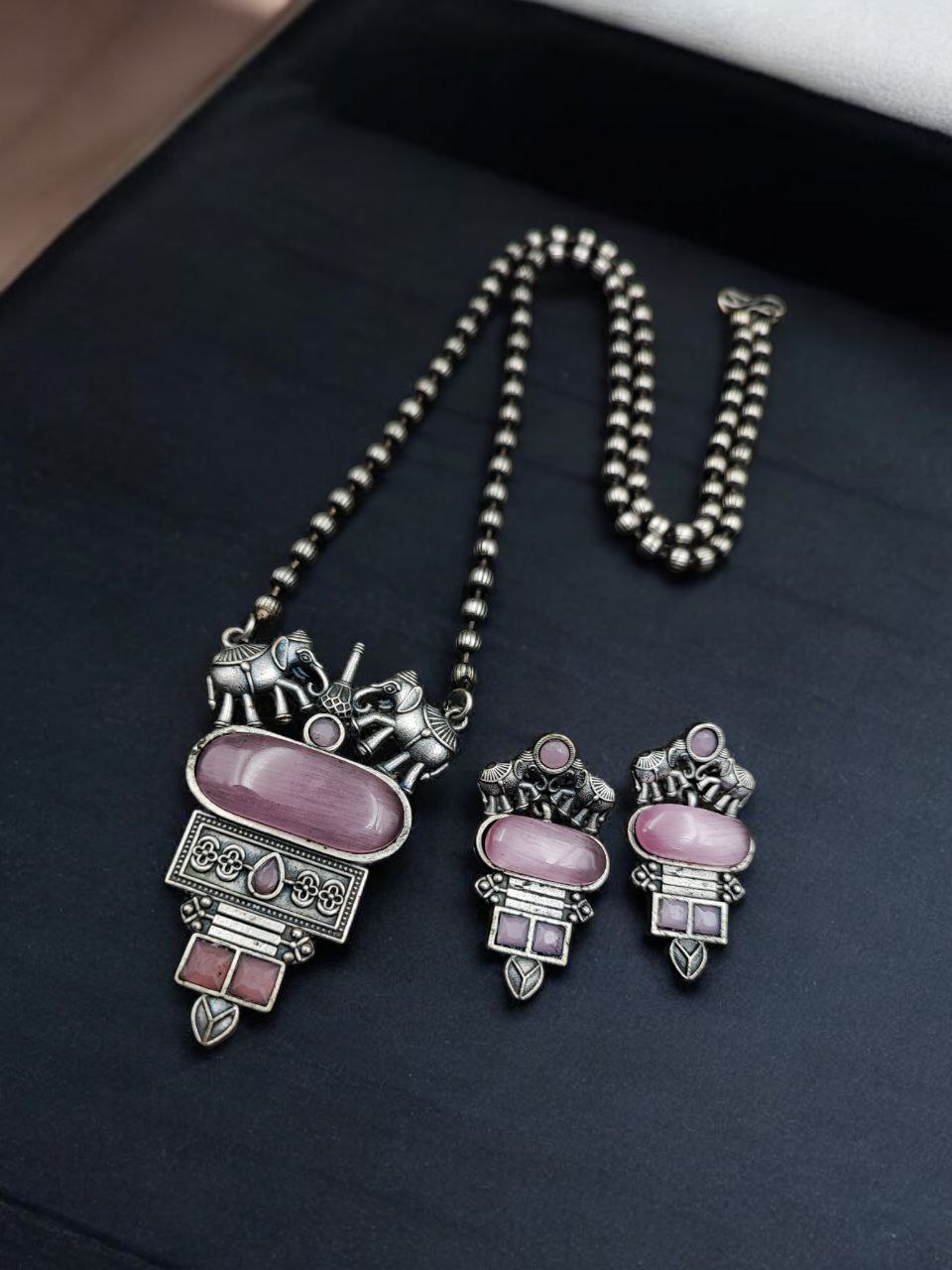 Babypink Indian Elephant Designer Oxidized Silver Monalisa Stone Necklace Chain Pendant with Earring Set